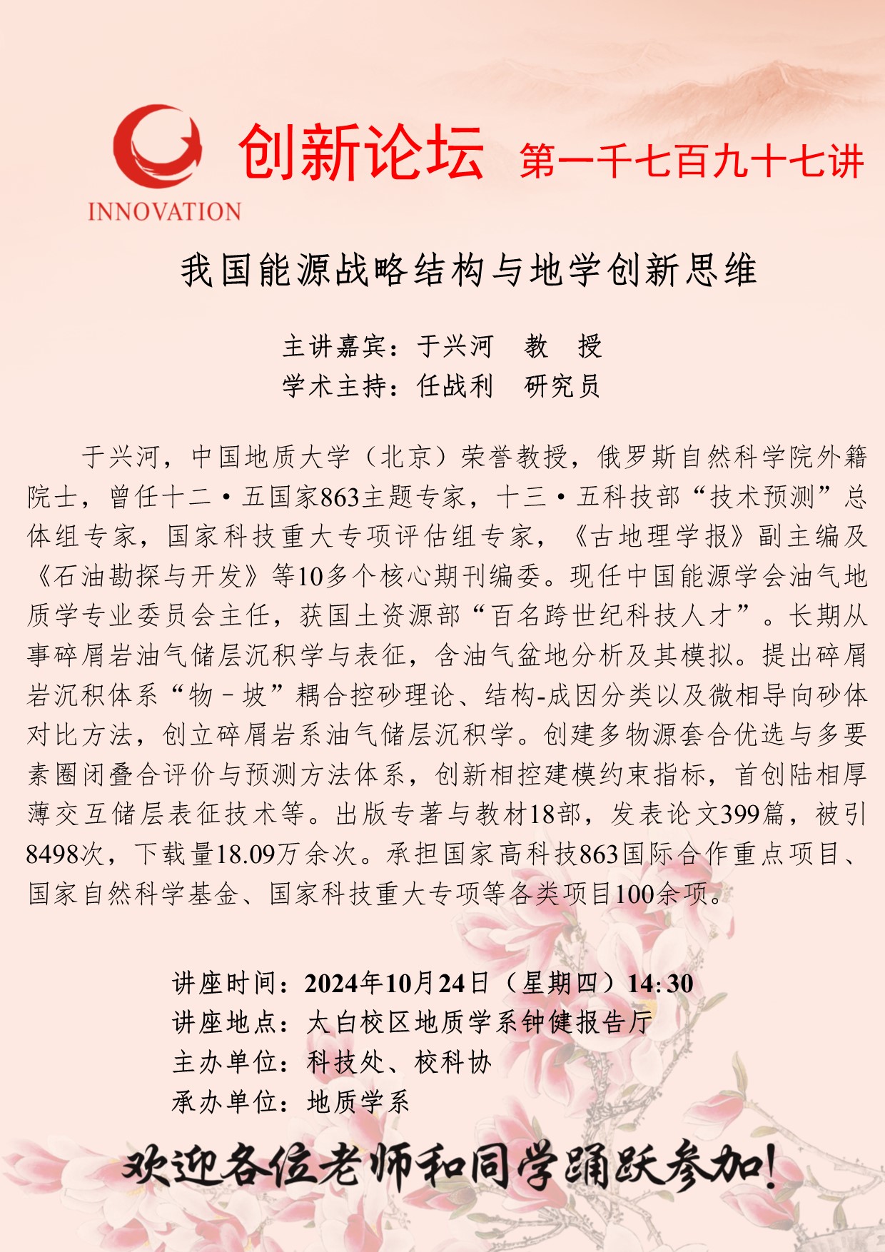 于兴河 教授 欧冠官方网站创新论坛第一千七百九十七讲:我国能源战略结构与地学创新思维 讲座时间 2024年10月24日(星期四)14:30 讲座地点 太白校区地质学系钟健报告厅 讲座人介绍 于兴河 教授 讲座内容