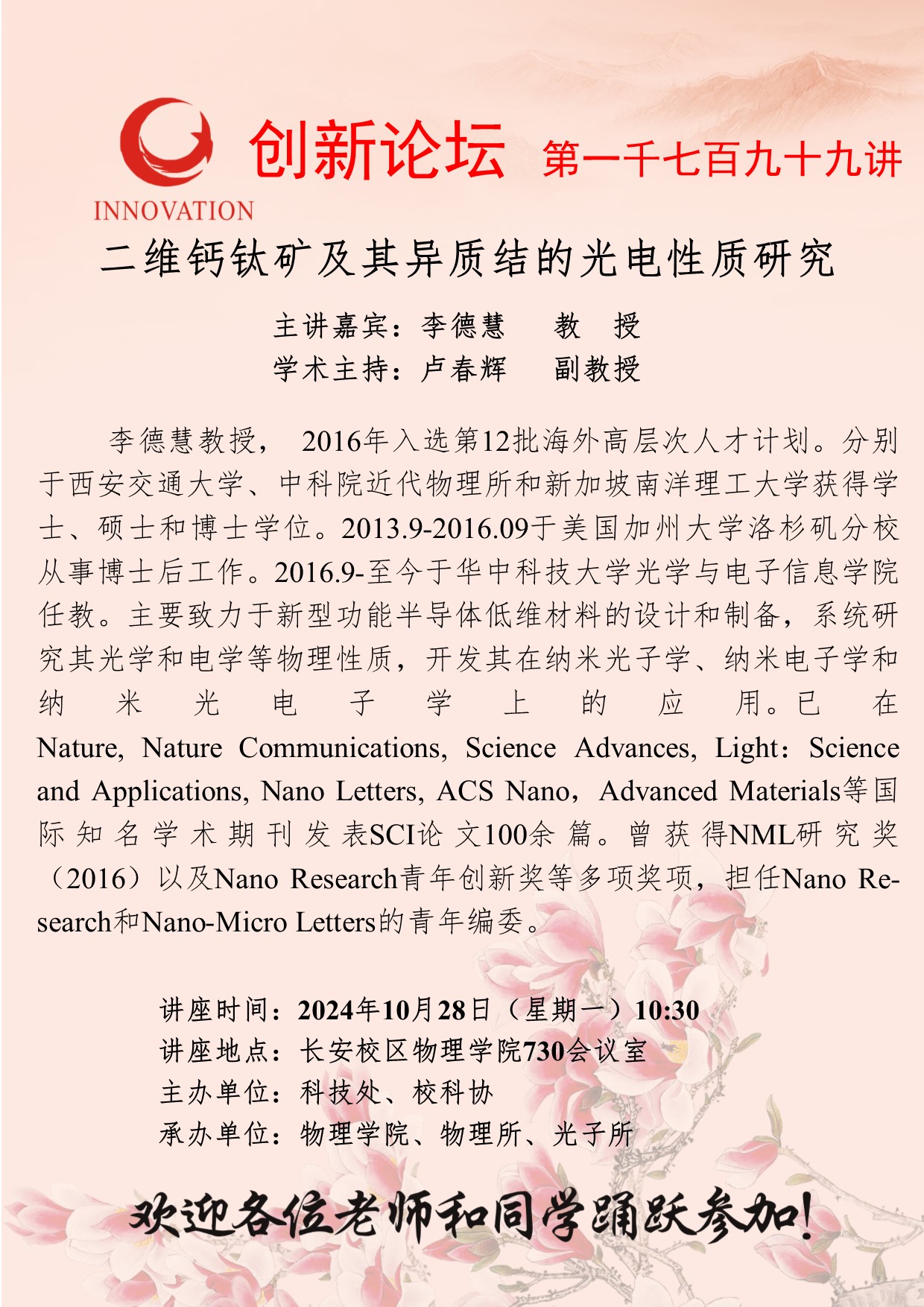 李德慧 教授 欧冠官方网站创新论坛第一千七百九十九讲:二维钙钛矿及其异质结的光电性质研究 讲座时间 2024年10月28日(星期一)10:30 讲座地点 长安区物理学院730会议室 讲座人介绍 李德慧 教授 讲座内容