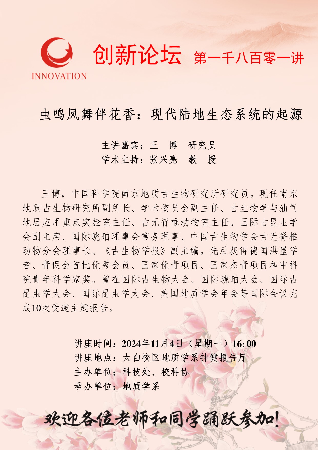 王 博 研究员 欧冠官方网站创新论坛第一千八百零一讲:虫鸣凤舞伴花香:现代陆地生态系统的起源 讲座时间 2024年11月4日(星期一)16:00 讲座地点 太白校区地质学系钟健报告厅 讲座人介绍 王 博 研究员 讲座内容