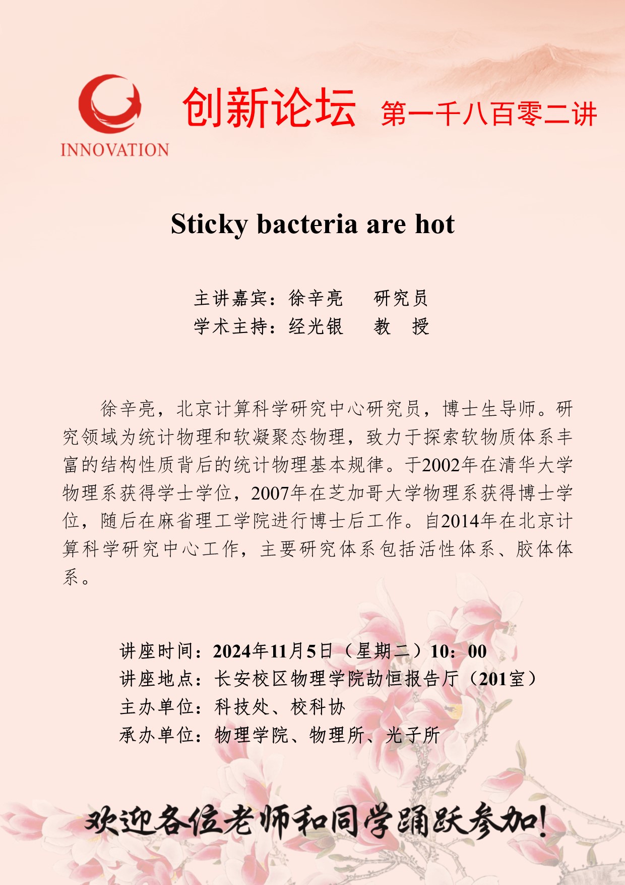徐辛亮 研究员 欧冠官方网站创新论坛第一千八百零二讲:Sticky bacteria are hot 讲座时间 2024年11月5日(星期二)10:00 讲座地点 长安校区物理学院劼恒报告厅(201室) 讲座人介绍 徐辛亮 研究员 讲座内容