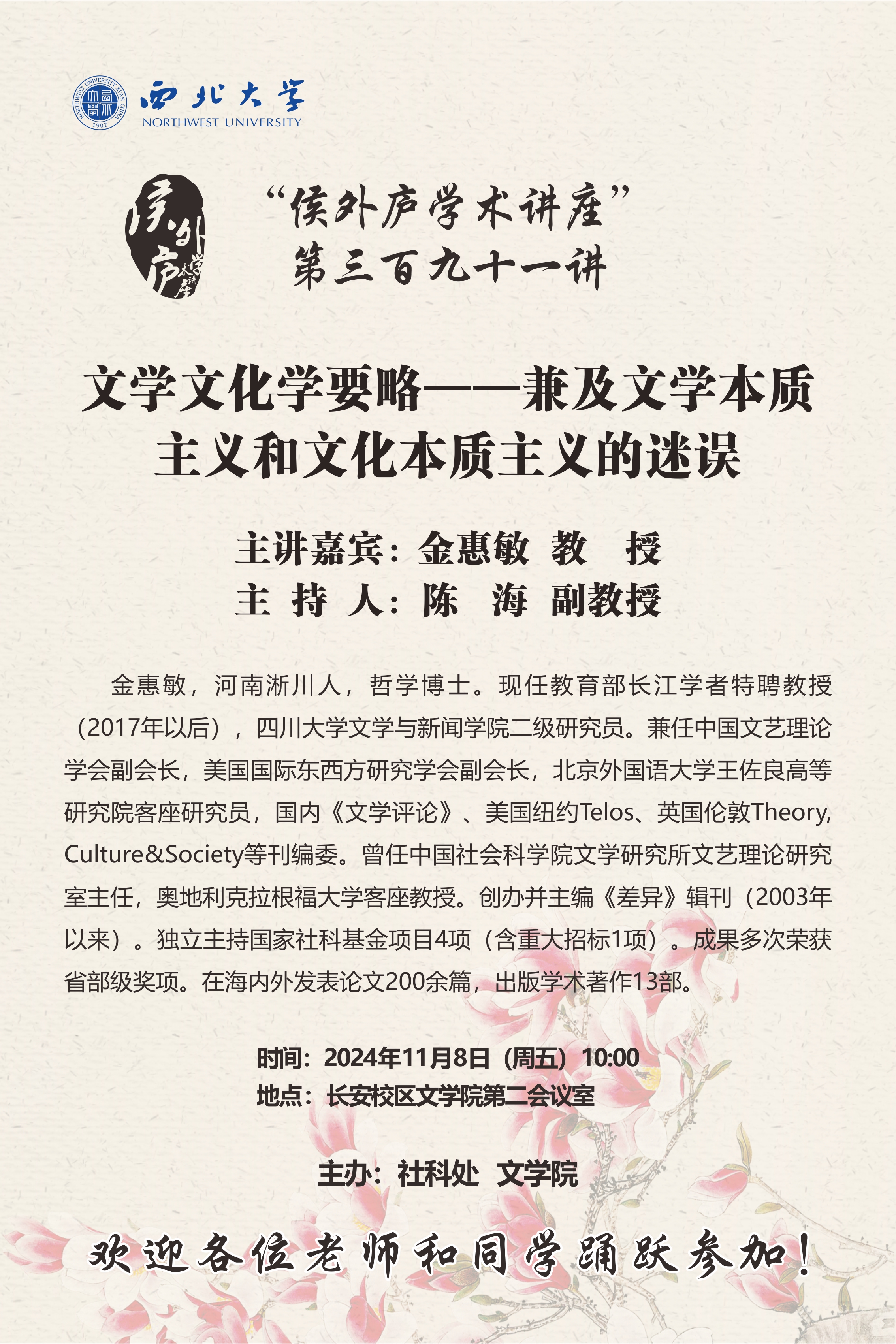 金惠敏 教授 “侯外庐学术讲座”第三百九十一讲:文学文化学要略——兼及文学本质主义和文化本质主义的迷误 讲座时间 2024年11月8日(周五)10:00 讲座地点 长安校区文学院第二会议室 讲座人介绍 金惠敏 教授 讲座内容
