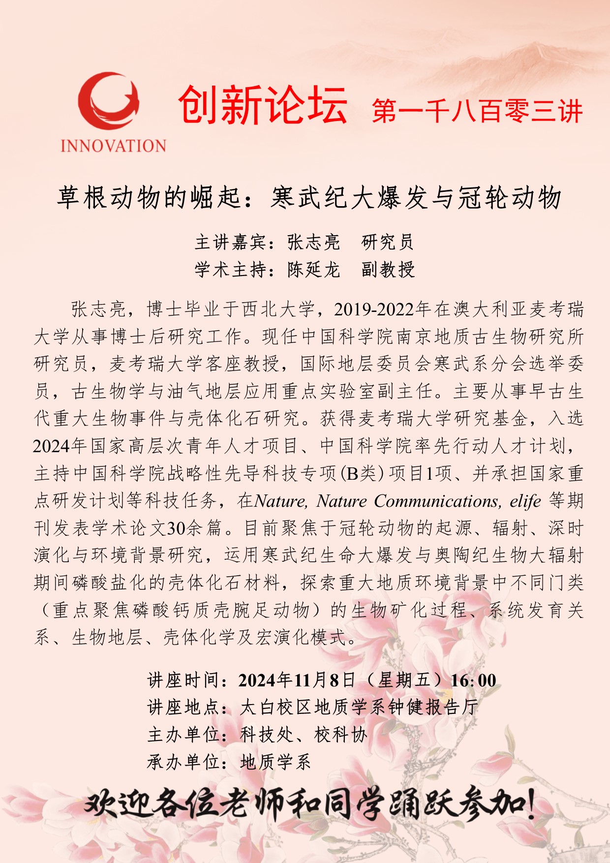 张志亮 研究员 欧冠官方网站创新论坛第一千八百零三讲:草根动物的崛起:寒武纪大爆发与冠轮动物 讲座时间 2024年11月8日(星期五)16:00 讲座地点 太白校区地质学系钟健报告厅 讲座人介绍 张志亮 研究员 讲座内容