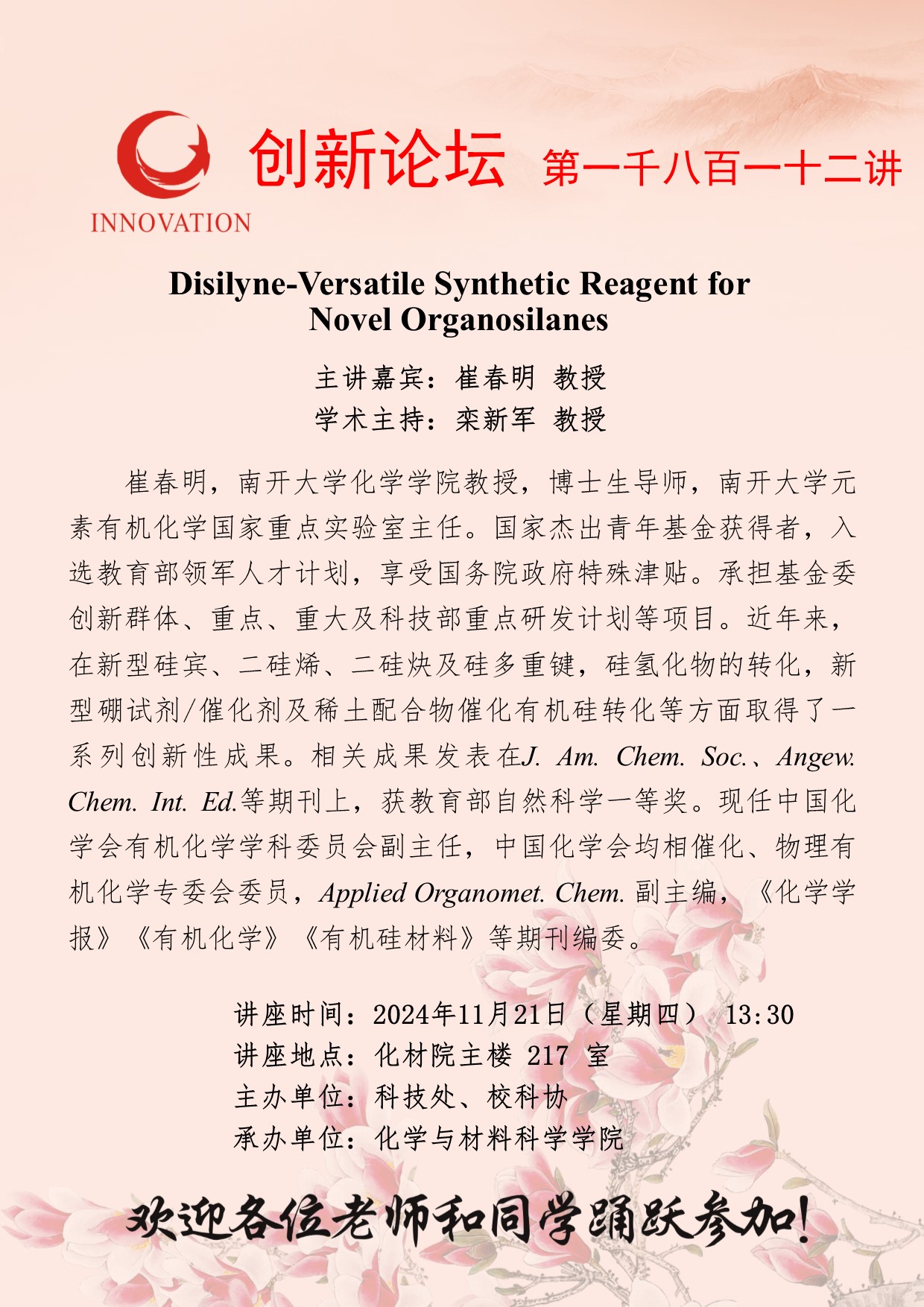 崔春明 教授 欧冠官方网站创新论坛第一千八百一十二讲:Disilyne-Versatile Synthetic Reagent for 讲座时间 2024年11月21日(星期四) 13:30 讲座地点 化材院主楼 217 室 讲座人介绍 崔春明 教授 讲座内容