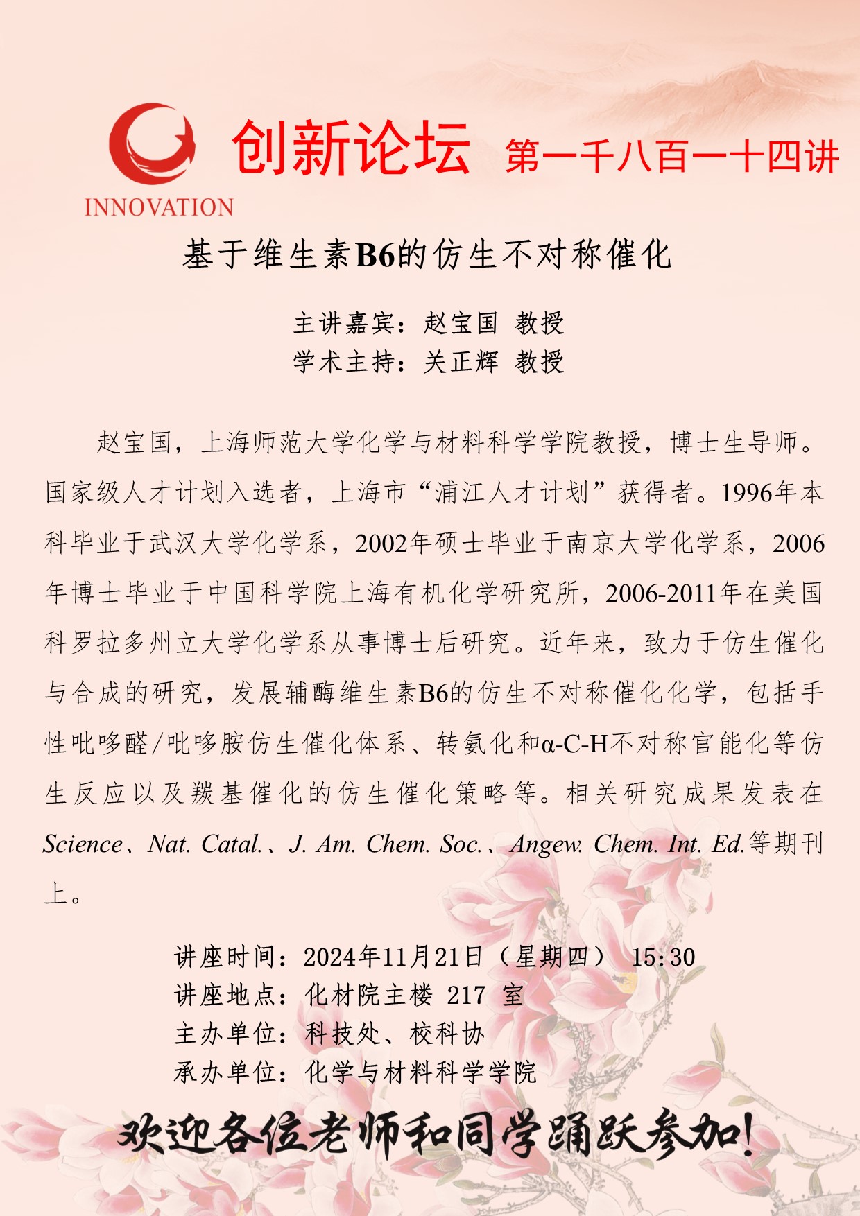 赵宝国 教授 欧冠官方网站创新论坛第一千八百一十四讲:基于维生素B6的仿生不对称催化 讲座时间 2024年11月21日(星期四) 15:30 讲座地点 化材院主楼 217 室 讲座人介绍 赵宝国 教授 讲座内容