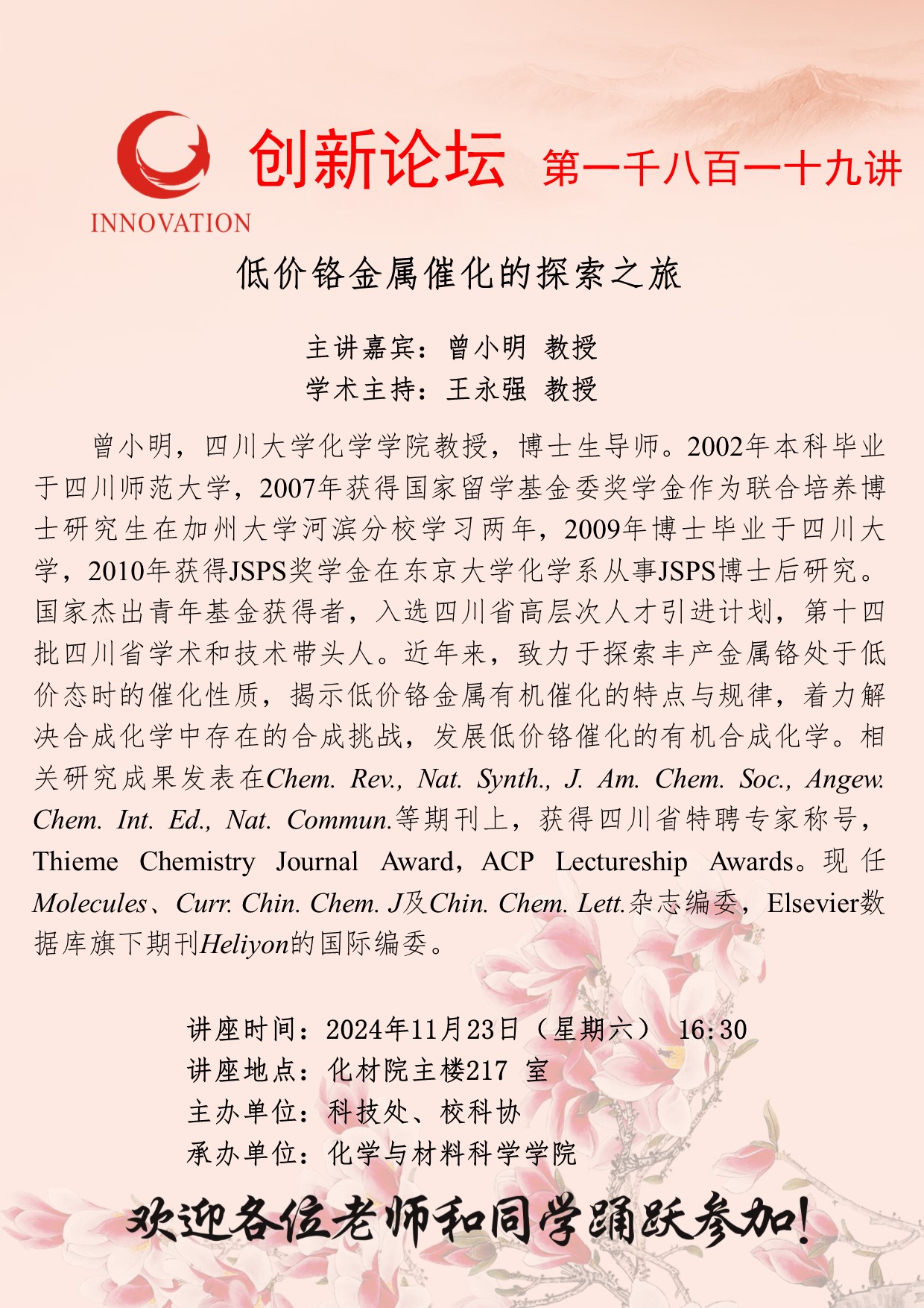 曾小明 教授 欧冠官方网站创新论坛第一千八百一十九讲:低价铬金属催化的探索之旅 讲座时间 2024年11月23日(星期六) 16:30 讲座地点 化材院主楼217 室 讲座人介绍 曾小明 教授 讲座内容