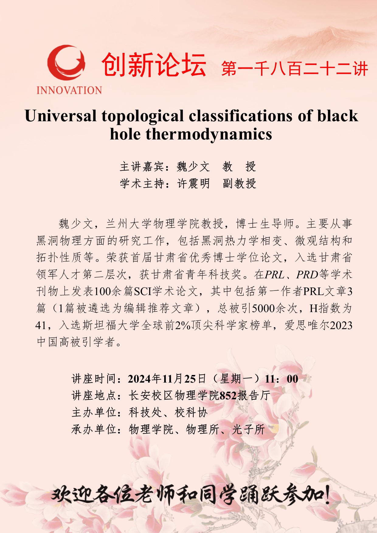 魏少文 教授 欧冠官方网站创新论坛第一千八百二十二讲:Universal topological classifications of black hole thermodynamics 讲座时间 2024年11月25日(星期一)11:00 讲座地点 长安校区物理学院852报告厅 讲座人介绍 魏少文 教授 讲座内容