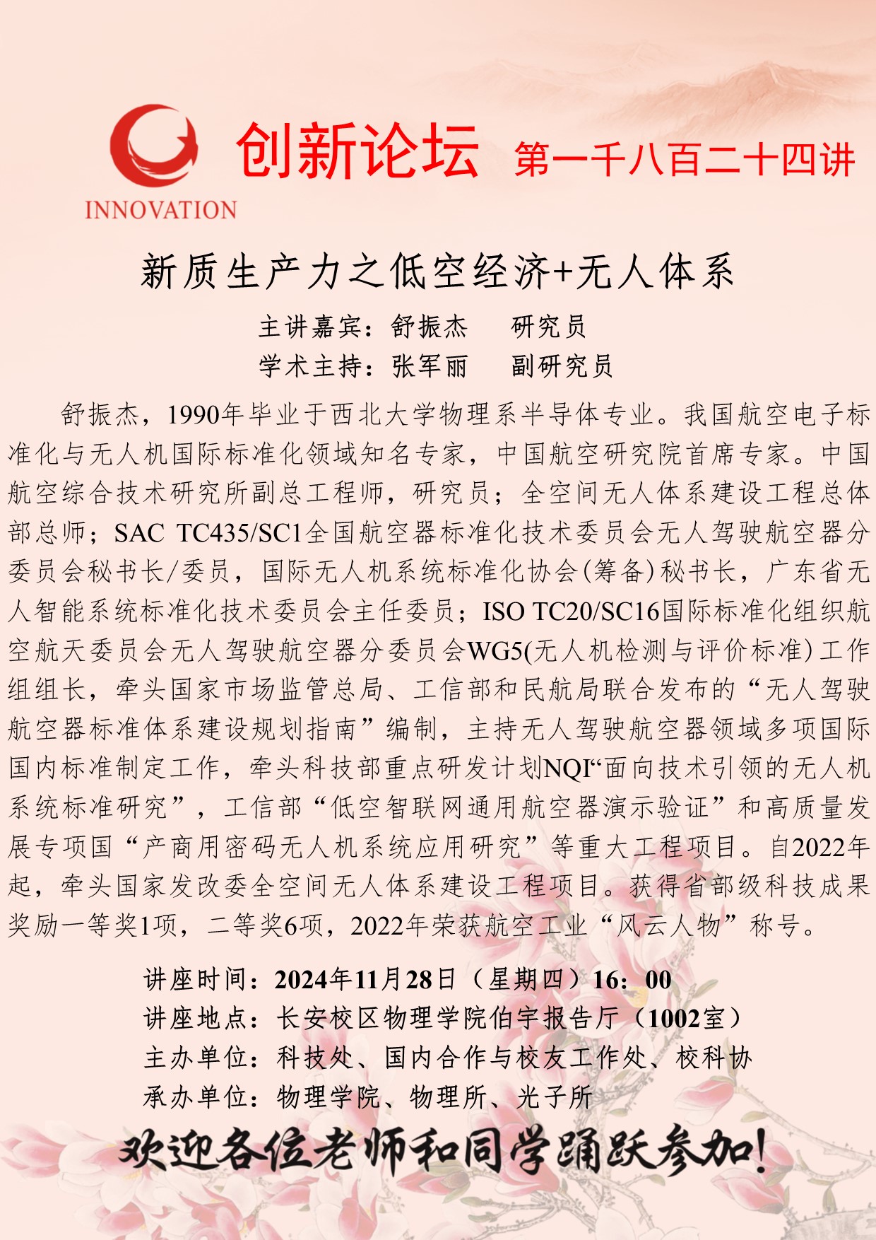 舒振杰 研究员 欧冠官方网站创新论坛第一千八百二十四讲:新质生产力之低空经济+无人体系 讲座时间 2024年11月28日(星期四)16:00 讲座地点 长安校区物理学院伯宇报告厅(1002室) 讲座人介绍 舒振杰 研究员 讲座内容