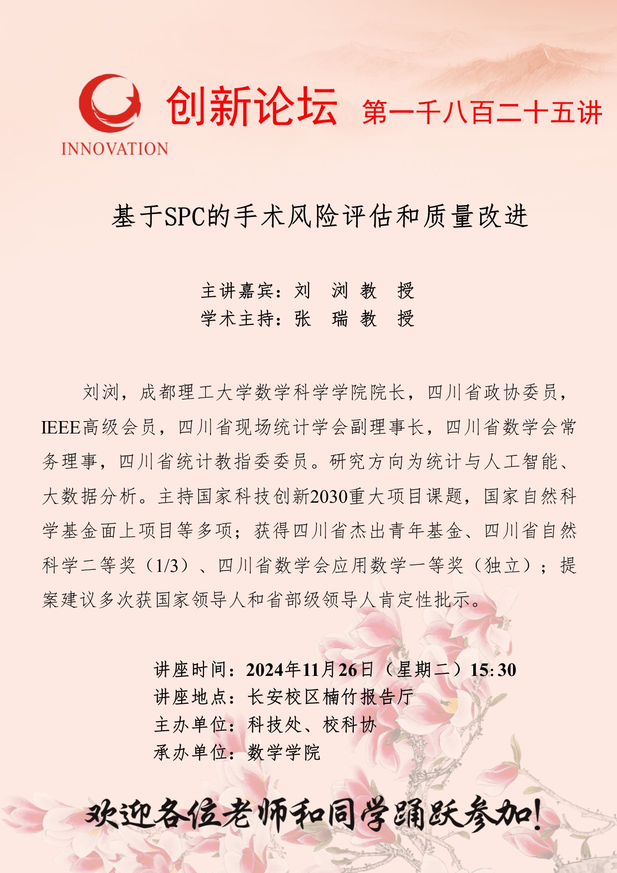 刘浏 教授 欧冠官方网站创新论坛第一千八百二十五讲:基于SPC的手术风险评估和质量改进 讲座时间 2024年11月26日(星期二)15:30 讲座地点 长安校区楠竹报告厅 讲座人介绍 刘浏 教授 讲座内容