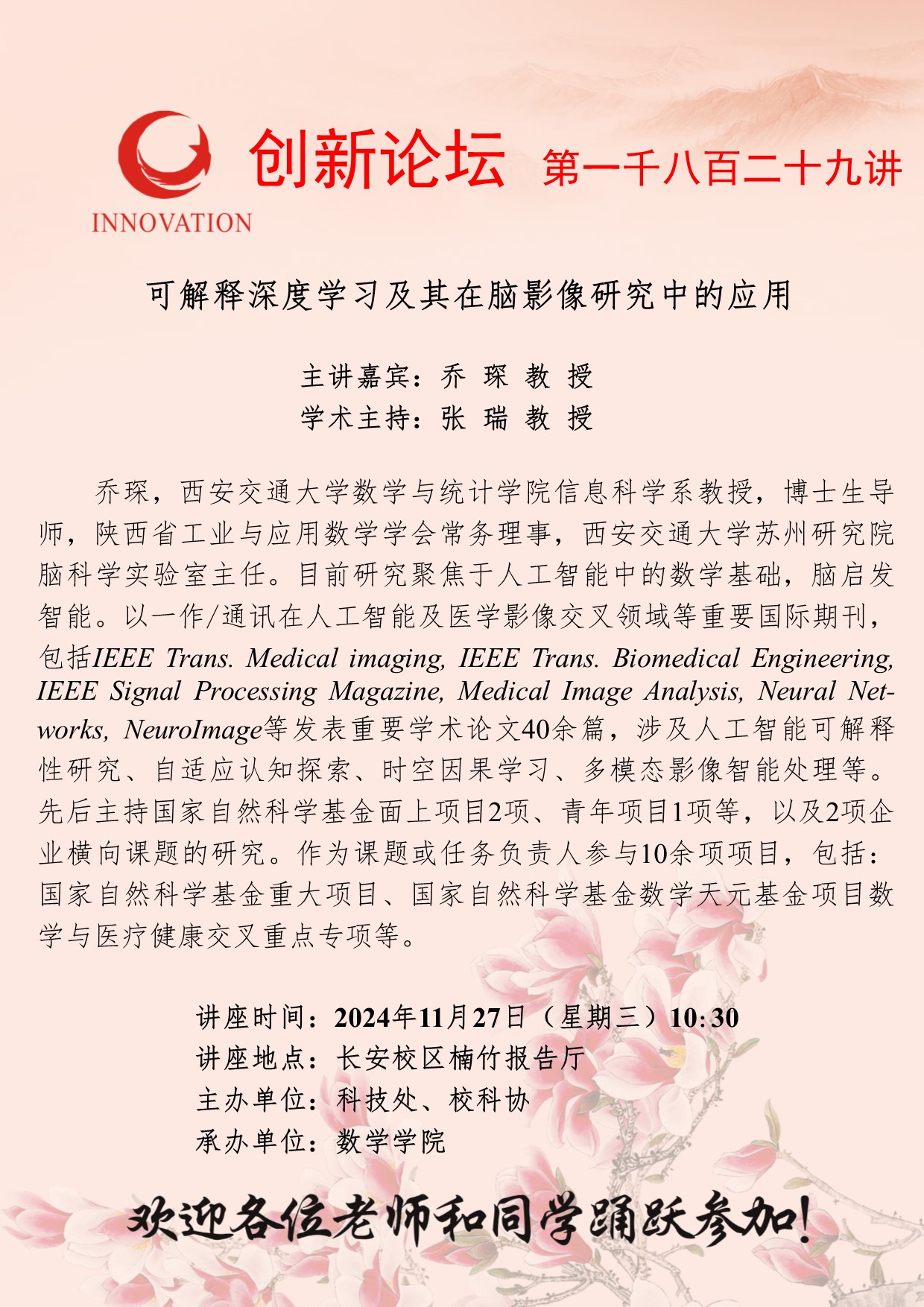 乔琛 教授 欧冠官方网站创新论坛第一千八百二十九讲:可解释深度学习及其在脑影像研究中的应用 讲座时间 2024年11月27日(星期三)10:30 讲座地点 长安校区楠竹报告厅 讲座人介绍 乔琛 教授 讲座内容