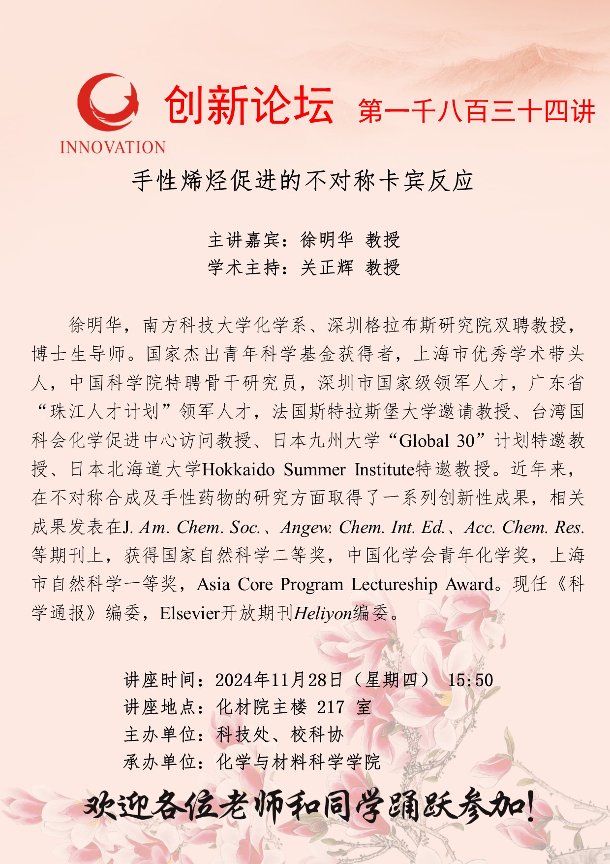 徐明华 教授 欧冠官方网站创新论坛第一千八百三十四讲:手性烯烃促进的不对称卡宾反应 讲座时间 2024年11月28日(星期四) 15:50 讲座地点 化材院主楼217室 讲座人介绍 徐明华 教授 讲座内容