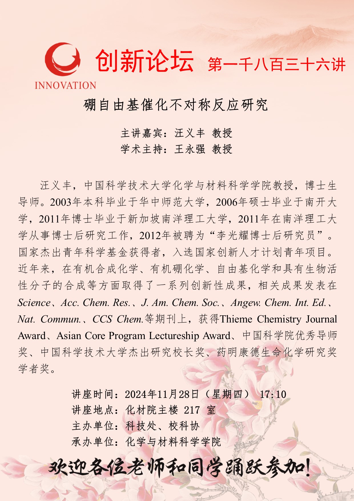 汪义丰 教授 欧冠官方网站创新论坛第一千八百三十六讲:硼自由基催化不对称反应研究 讲座时间 2024年11月28日(星期四) 17:10 讲座地点 化材院主楼217室 讲座人介绍 汪义丰 教授 讲座内容