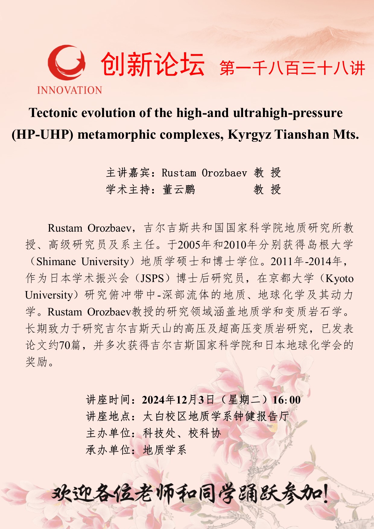 Rustam Orozbaev 教 授 欧冠官方网站创新论坛第一千八百三十八讲:Tectonic evolution of the high-and ultrahigh-pressure (HP-UHP) metamorphic complexes, Kyrgyz Tianshan Mts. 讲座时间 2024年12月3日(星期二)16:00 讲座地点 太白校区地质学系钟健报告厅 讲座人介绍 Rustam Orozbaev 教 授 讲座内容
