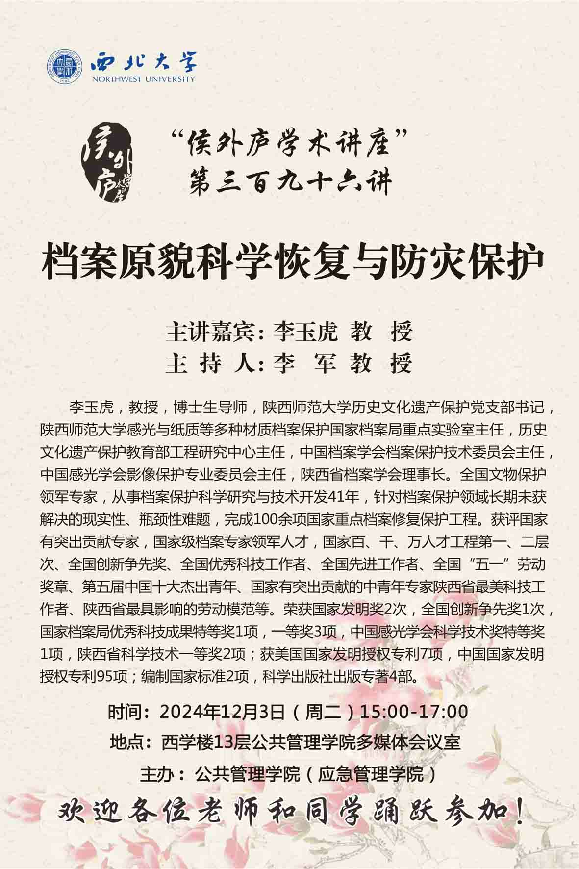李玉虎 教授 “侯外庐学术讲座”第三百九十六讲:档案原貌科学恢复与防灾保护 讲座时间 2024年12月3日(周二)15:00 讲座地点 西学楼13层公管学院多媒体会议室 讲座人介绍 李玉虎 教授 讲座内容