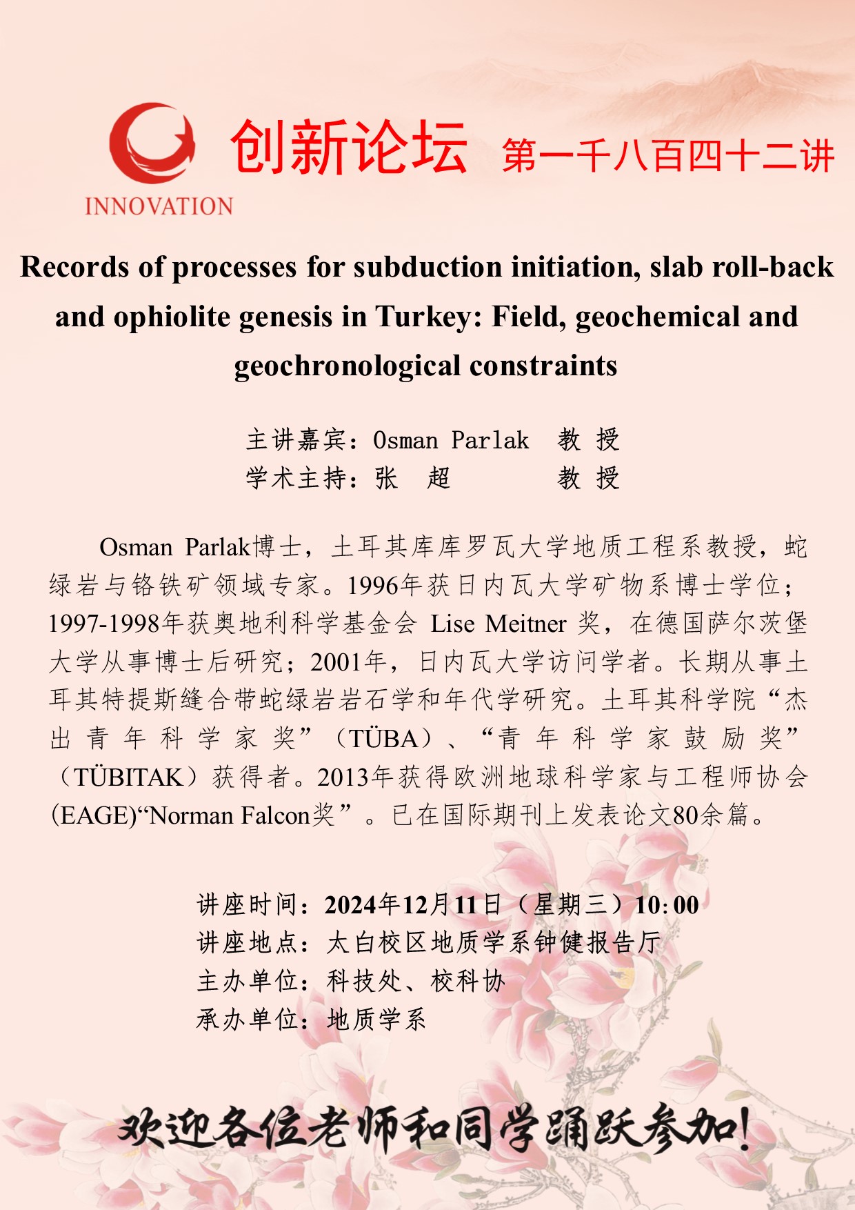 Osman Parlak 教授 欧冠官方网站创新论坛第一千八百四十二讲:Records of processes for subduction initiation, slab roll-back and ophiolite genesis in Turkey: Field, geochemical and geochronological constraints 讲座时间 2024年12月11日(星期三)10:00 讲座地点 太白校区地质学系钟健报告厅 讲座人介绍 Osman Parlak 教授 讲座内容