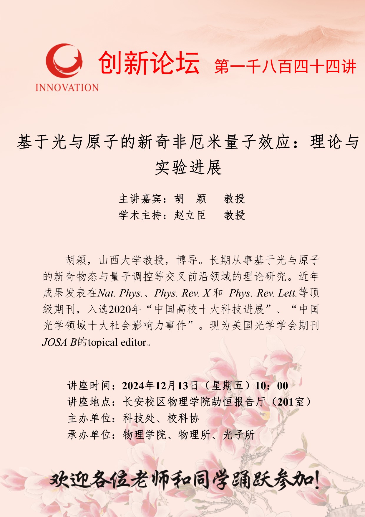 胡颖 教授 欧冠官方网站创新论坛第一千八百四十四讲:基于光与原子的新奇非厄米量子效应:理论与实验进展 讲座时间 2024年12月13日(星期五)10:00 讲座地点 长安校区物理学院劼恒报告厅(201室) 讲座人介绍 胡颖 教授 讲座内容