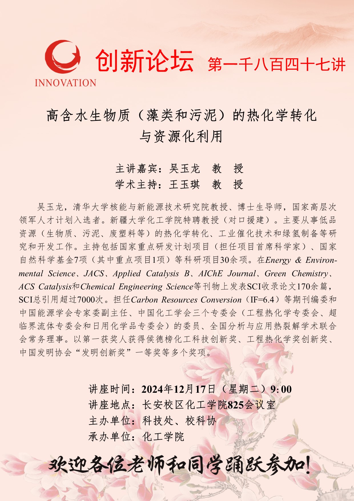 吴玉龙 教授 欧冠官方网站创新论坛第一千八百四十七讲:高含水生物质(藻类和污泥)的热化学转化与资源化利用 讲座时间 2024年12月17日(星期二)9:00 讲座地点 长安校区化工学院825会议室 讲座人介绍 吴玉龙 教授 讲座内容