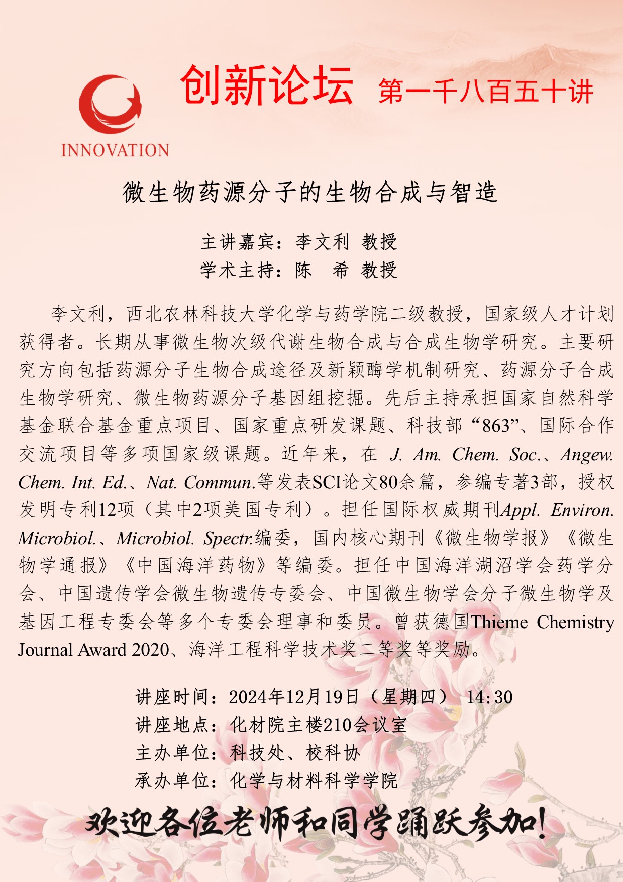 李文利 教授 欧冠官方网站创新论坛第一千八百五十讲:微生物药源分子的生物合成与智造 讲座时间 2024年12月19日(星期四) 14:30 讲座地点 化材院主楼210会议室 讲座人介绍 李文利 教授 讲座内容