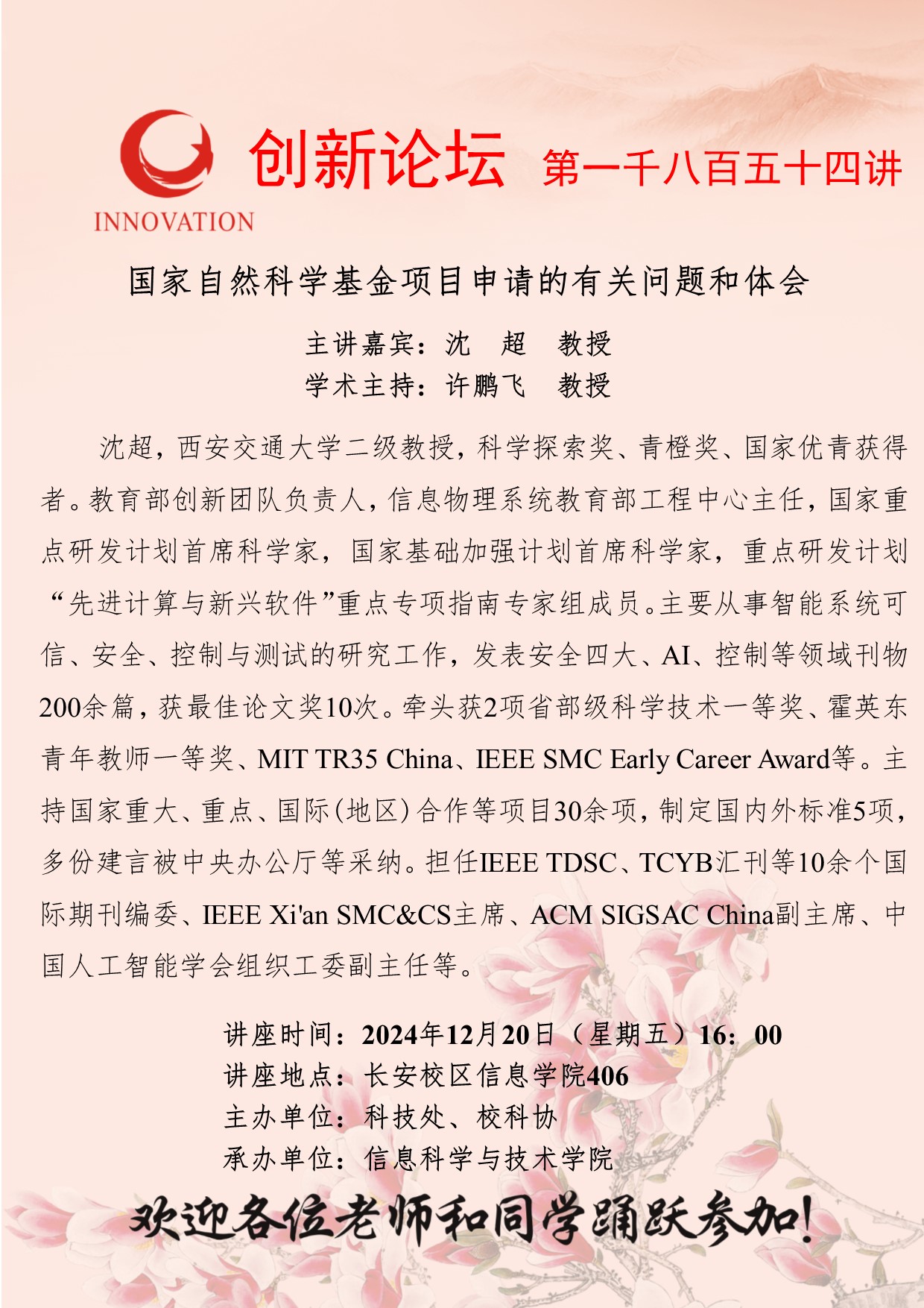 沈超 教授 欧冠官方网站创新论坛第一千八百五十四讲:国家自然科学基金项目申请的有关问题和体会 讲座时间 2024年12月20日(星期五) 16:00 讲座地点 长安校区信息学院406 讲座人介绍 沈超 教授 讲座内容