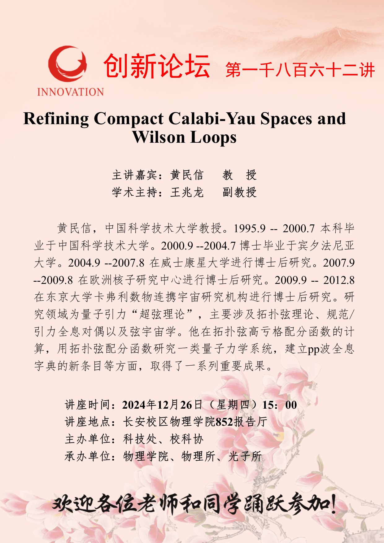 黄民信 教授 欧冠官方网站创新论坛第一千八百六十二讲:Refining Compact Calabi-Yau Spaces and Wilson Loops 讲座时间 2024年12月26日(星期四)15:00 讲座地点 长安校区物理学院852报告厅 讲座人介绍 黄民信 教授 讲座内容