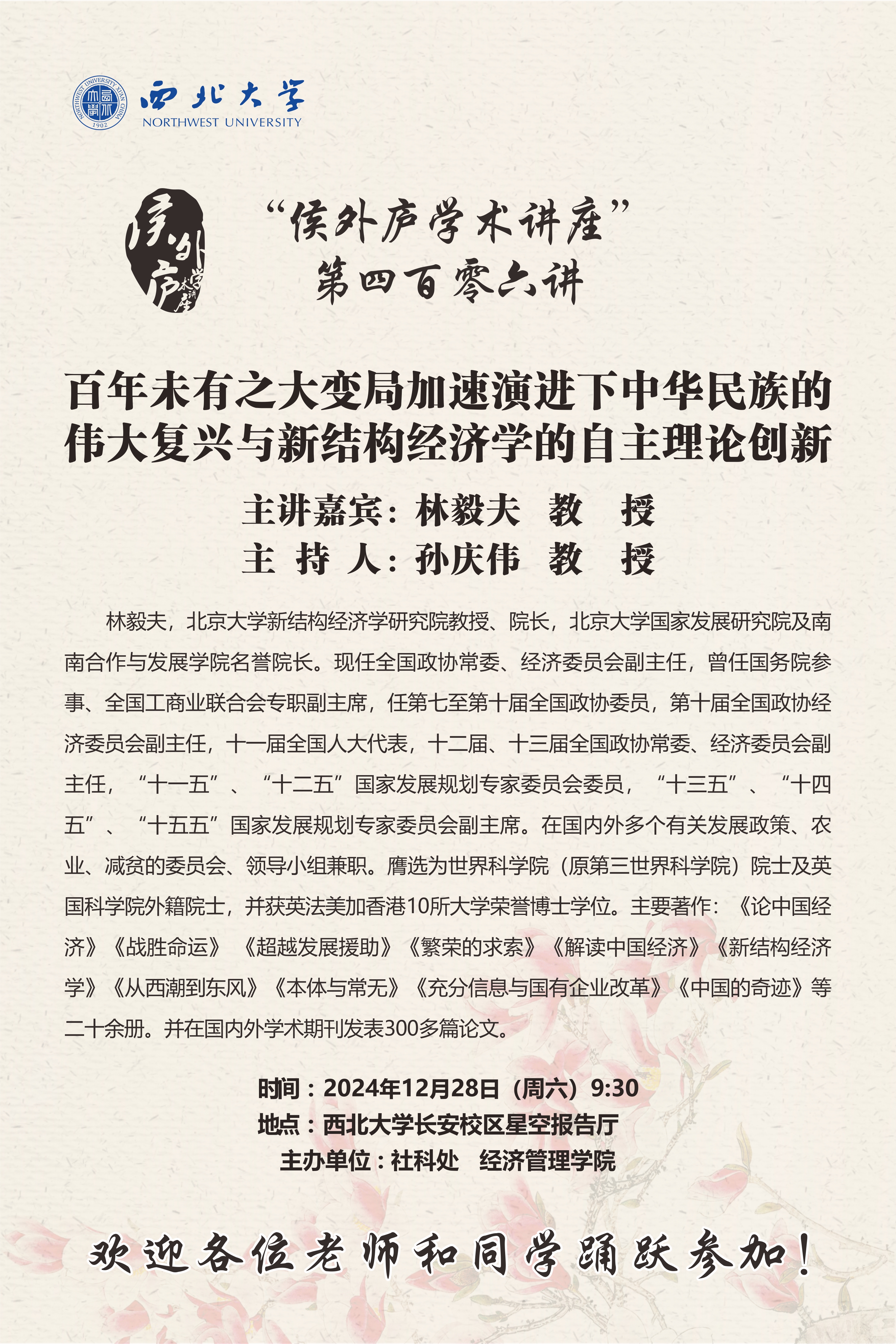 林毅夫 教授 “侯外庐学术讲座”第四百零六讲:百年未有之大变局加速演进下中华民族的伟大复兴与新结构经济学的自主理论创新 讲座时间 2024年12月28日(周六)9:30 讲座地点 欧冠官方网站长安校区星空报告厅 讲座人介绍 林毅夫 教授 讲座内容
