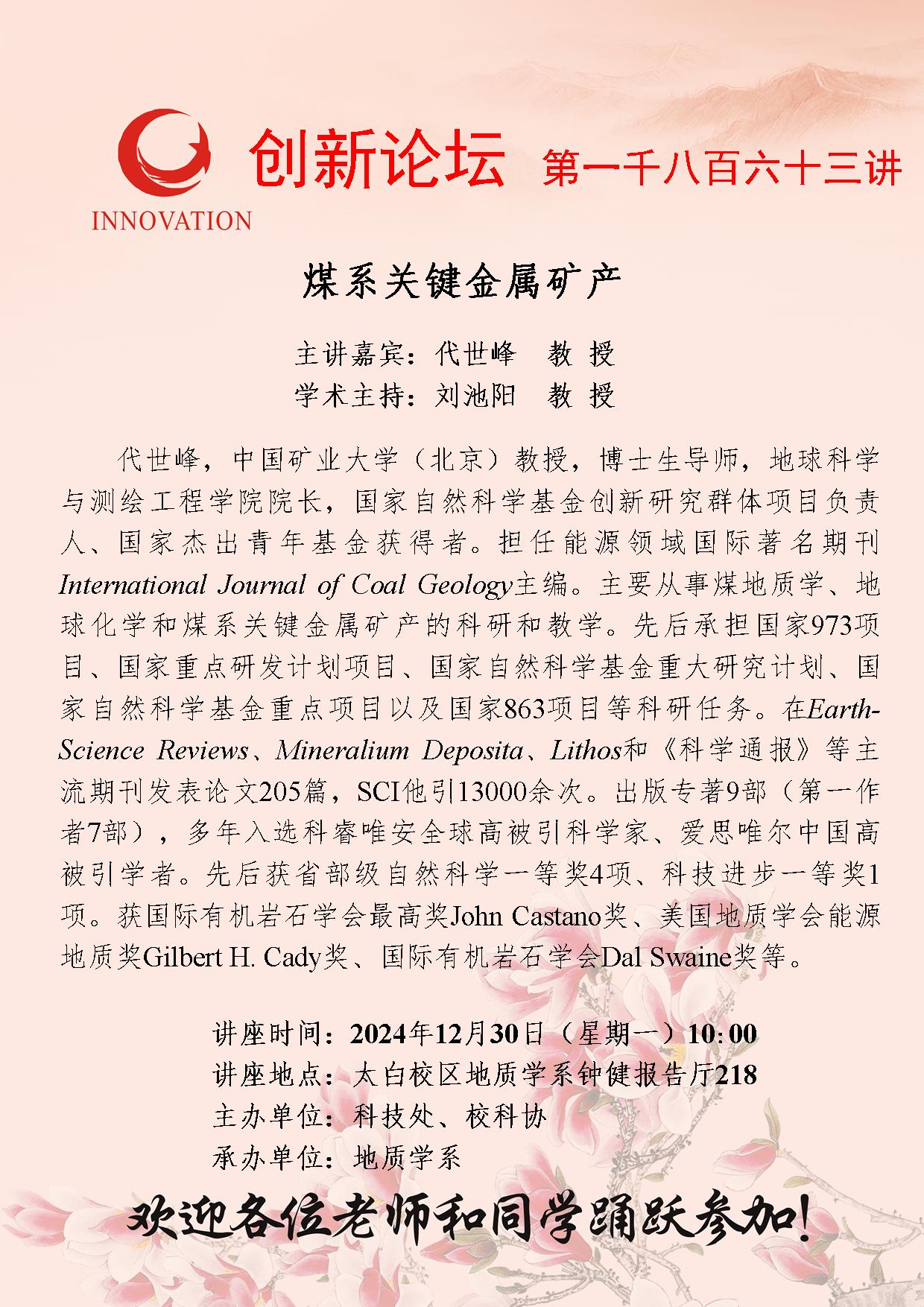 代世峰 教授 欧冠官方网站创新论坛第一千八百六十三讲:煤系关键金属矿产 讲座时间 2024年12月30日(星期一)10:00 讲座地点 太白校区地质学系钟健报告厅218 讲座人介绍 代世峰 教授 讲座内容