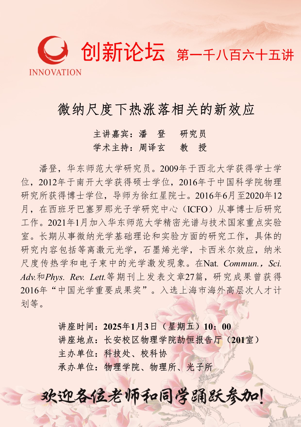 潘登 研究员 欧冠官方网站创新论坛第一千八百六十五讲:微纳尺度下热涨落相关的新效应 讲座时间 2025年1月3日(星期五)10:00 讲座地点 长安校区物理学院劼恒报告厅(201室) 讲座人介绍 潘登 研究员 讲座内容