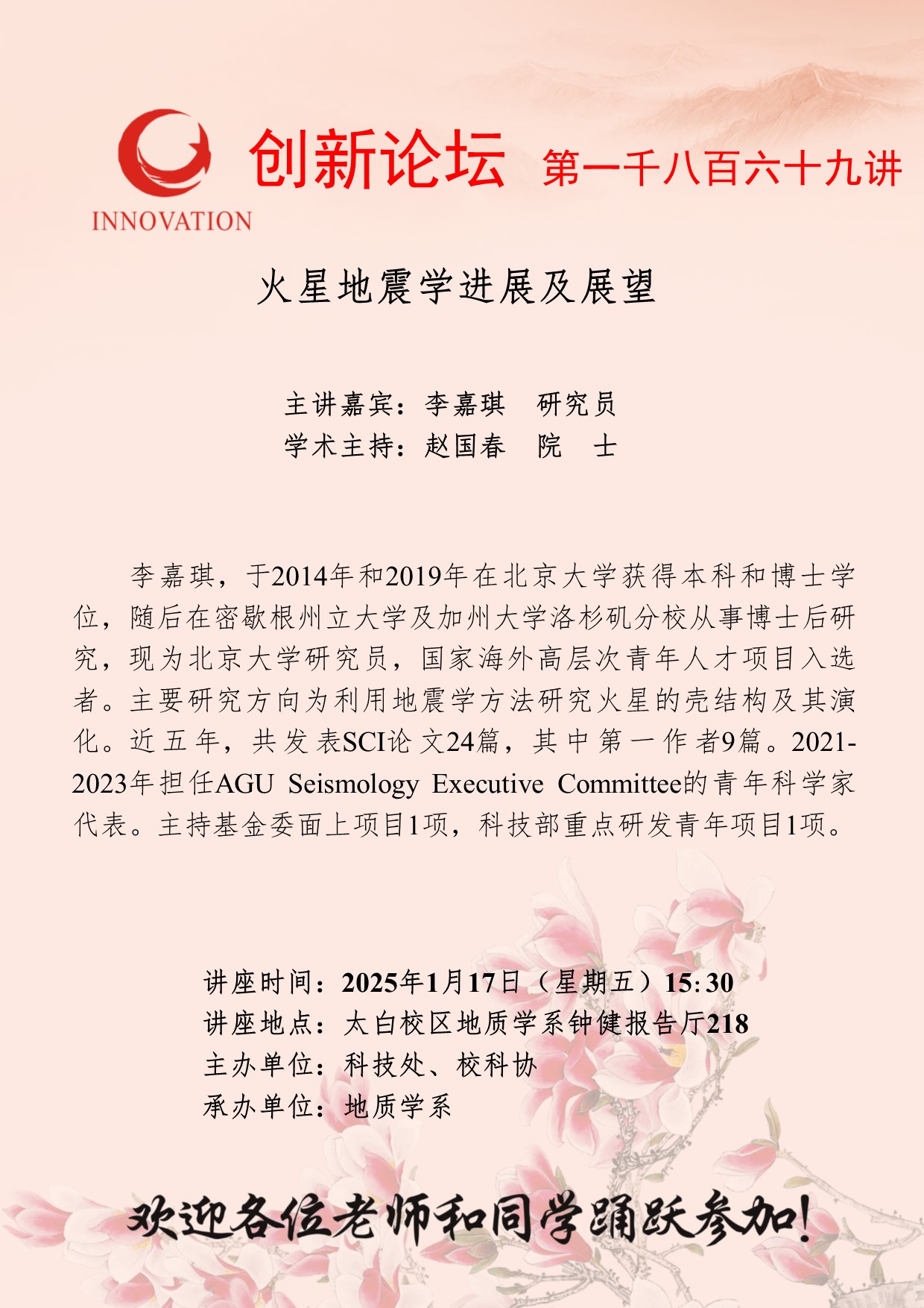 李嘉琪 研究员 欧冠官方网站创新论坛第一千八百六十九讲:火星地震学进展及展望 讲座时间 2025年1月17日(星期五)15:30 讲座地点 太白校区地质学系钟健报告厅218 讲座人介绍 李嘉琪 研究员 讲座内容