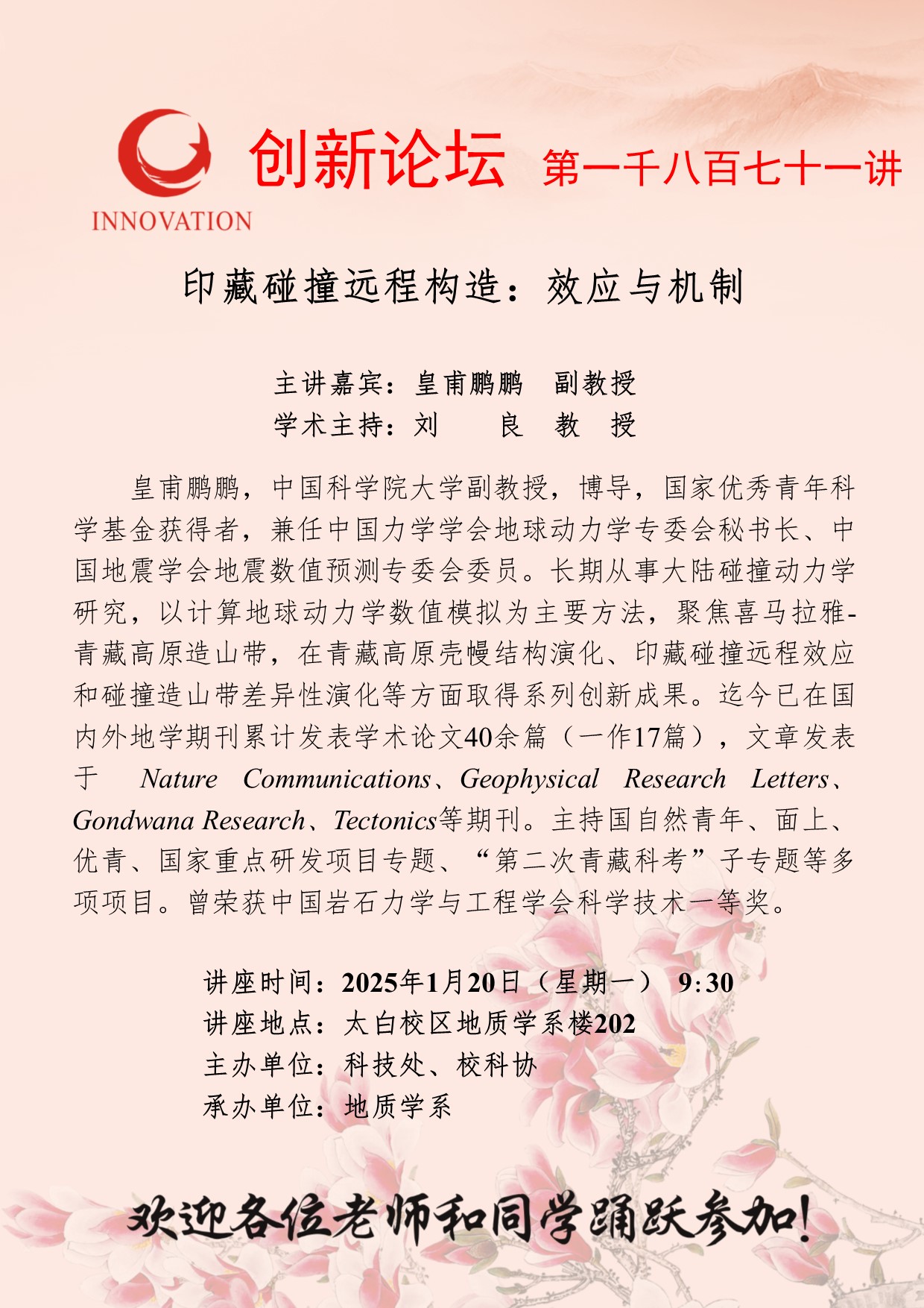 皇甫鹏鹏 副教授 欧冠官方网站创新论坛第一千八百七十一讲:印藏碰撞远程构造:效应与机制 讲座时间 2025年1月20日(星期一) 9:30 讲座地点 太白校区地质学系楼202 讲座人介绍 皇甫鹏鹏 副教授 讲座内容