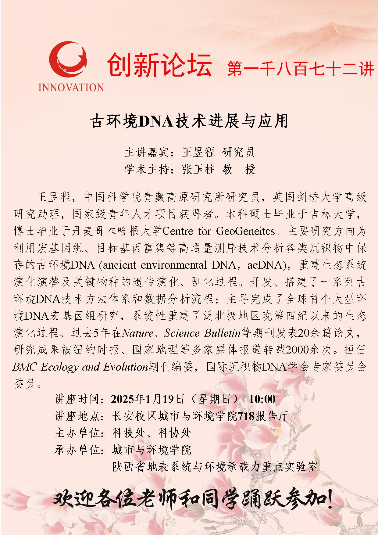 王昱程 研究员 欧冠官方网站创新论坛第一千八百七十二讲:古环境DNA技术进展与应用 讲座时间 2025年1月19日(星期日) 10:00 讲座地点 长安校区城市与环境学院718报告厅 讲座人介绍 王昱程 研究员 讲座内容