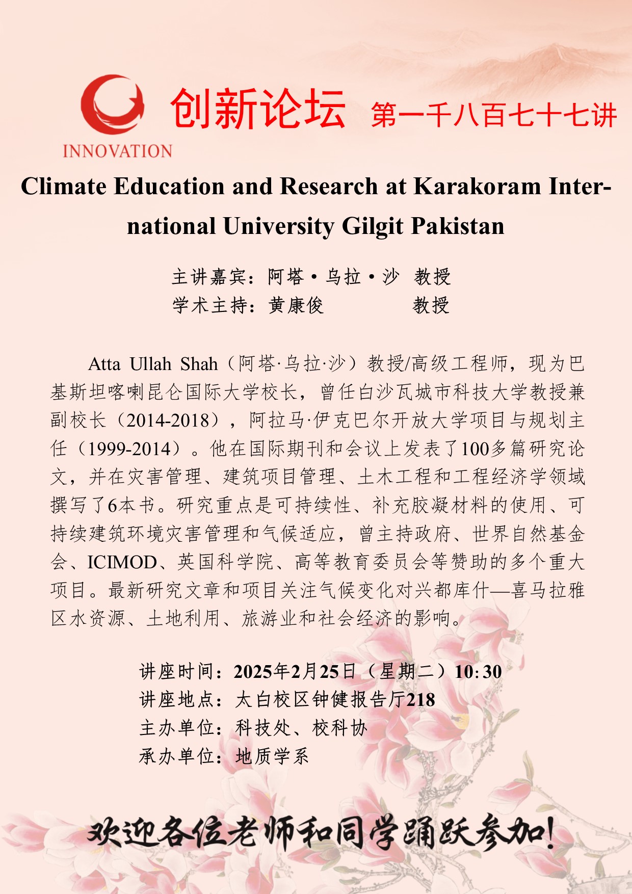 阿塔·乌拉·沙 教授 欧冠官方网站创新论坛第一千八百七十七讲:Climate Education and Research at Karakoram International University Gilgit Pakistan 讲座时间 2025年2月25日(星期二)10:30 讲座地点 太白校区钟健报告厅218 讲座人介绍 阿塔·乌拉·沙 教授 讲座内容