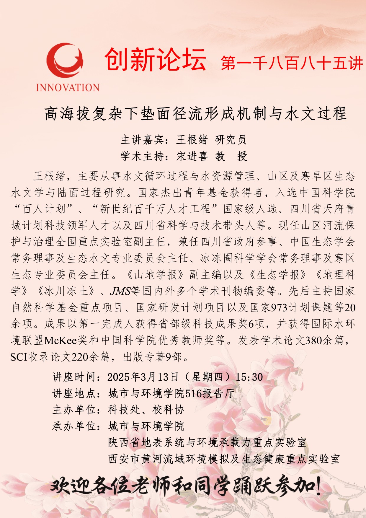 王根绪 研究员 欧冠官方网站创新论坛第一千八百八十五讲:高海拔复杂下垫面径流形成机制与水文过程模拟 讲座时间 2025年3月13日(星期四)15:30 讲座地点 城市与环境学院516报告厅 讲座人介绍 王根绪 研究员 讲座内容