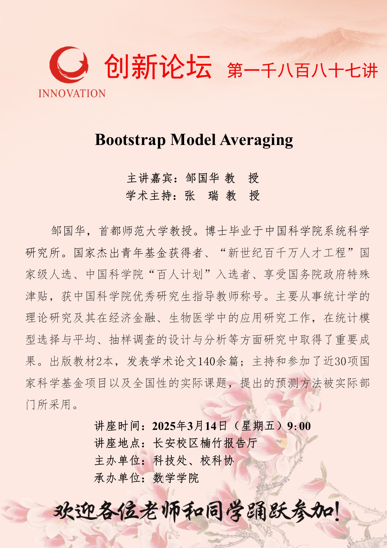 邹国华 教授 欧冠官方网站创新论坛第一千八百八十七讲:Bootstrap Model Averaging 讲座时间 2025年3月14日(星期五)9:00 讲座地点 长安校区楠竹报告厅 讲座人介绍 邹国华 教授 讲座内容