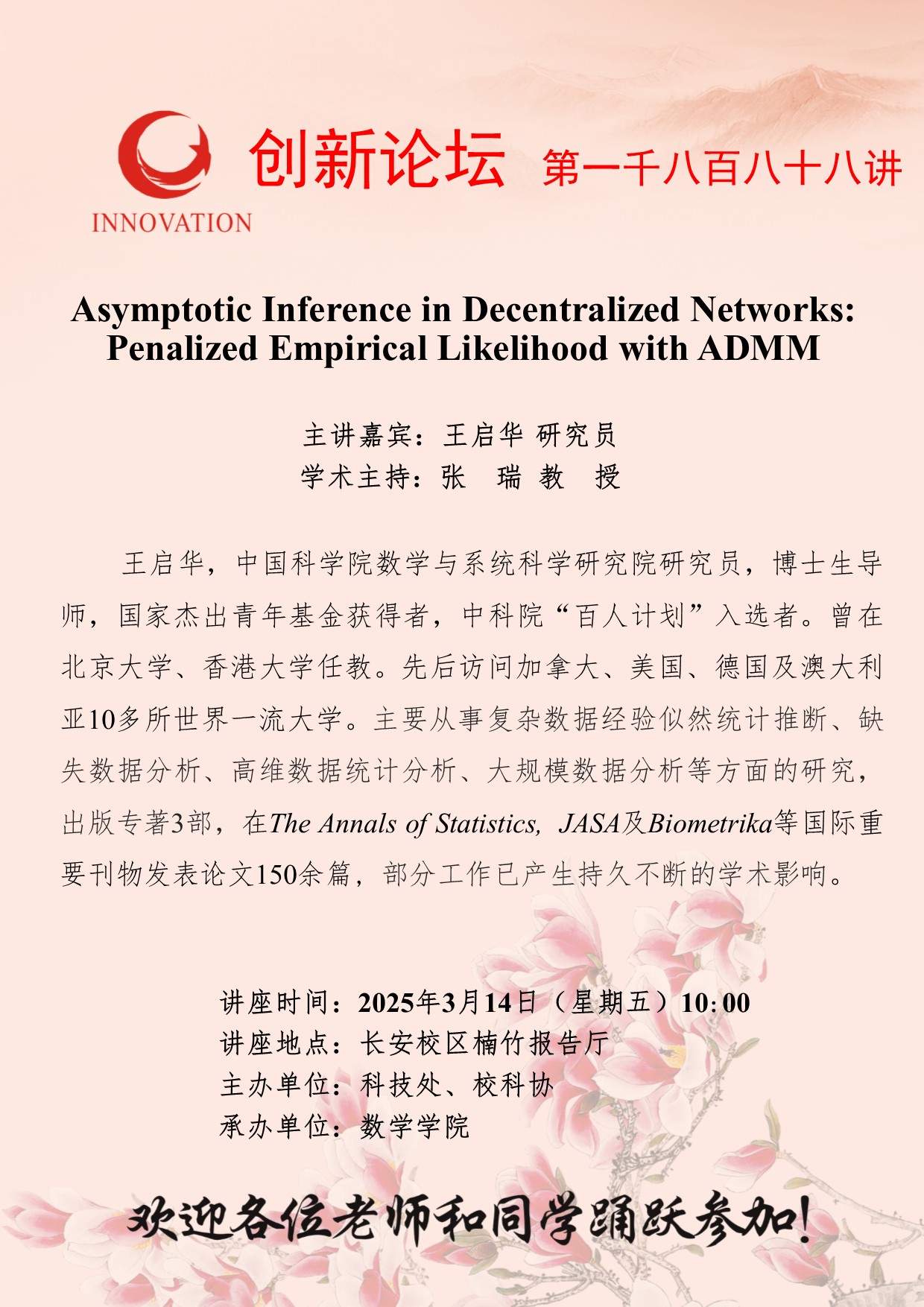 王启华 研究员 欧冠官方网站创新论坛第一千八百八十八讲:Asymptotic Inference in Decentralized Networks: Penalized Empirical Likelihood with ADMM 讲座时间 2025年3月14日(星期五)10:00 讲座地点 长安校区楠竹报告厅 讲座人介绍 王启华 研究员 讲座内容