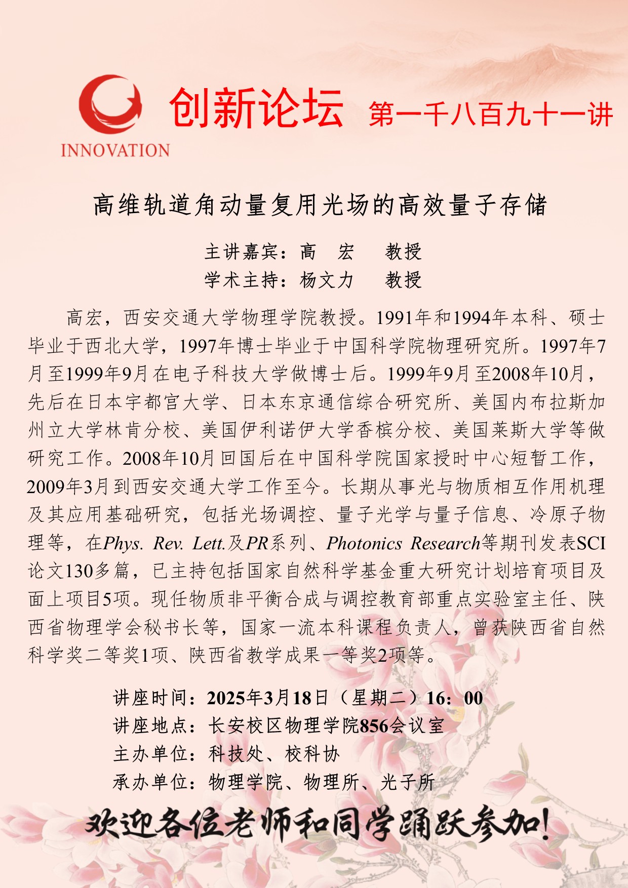 高宏 教授 欧冠官方网站创新论坛第一千八百九十一讲:高维轨道角动量复用光场的高效量子存储 讲座时间 2025年3月18日(星期二)16:00 讲座地点 长安校区物理学院856会议室 讲座人介绍 高宏 教授 讲座内容