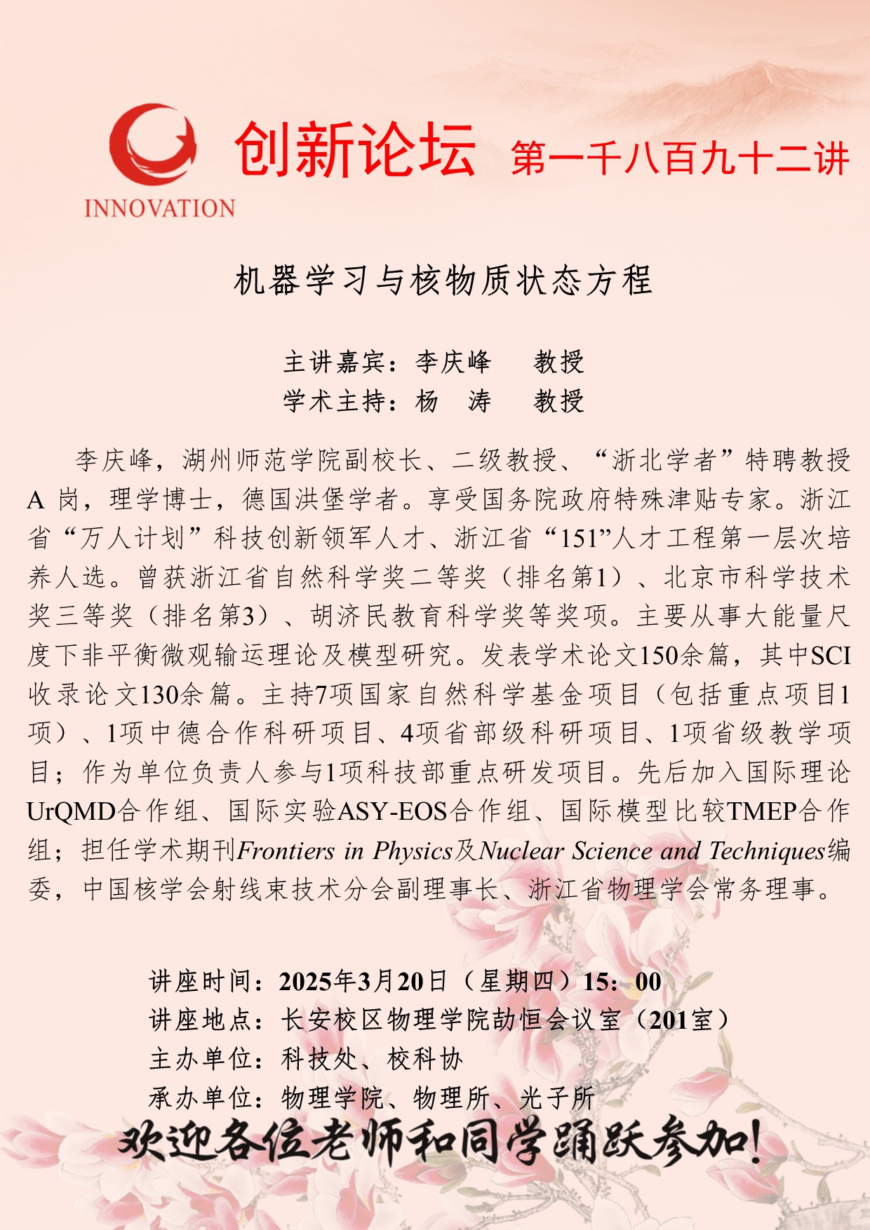 李庆峰 教授 欧冠官方网站创新论坛第一千八百九十二讲:机器学习与核物质状态方程 讲座时间 2025年3月20日(星期四)15:00 讲座地点 长安校区物理学院劼恒会议室(201室) 讲座人介绍 李庆峰 教授 讲座内容
