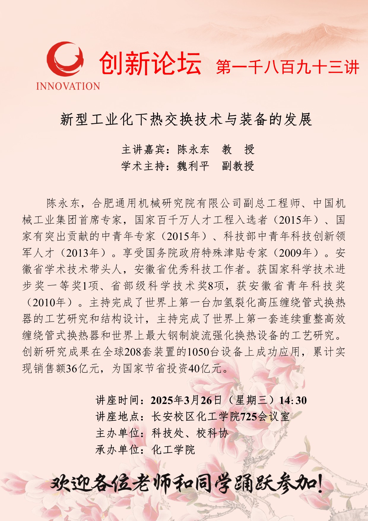 陈永东 教授 欧冠官方网站创新论坛第一千八百九十三讲:新型工业化下热交换技术与装备的发展 讲座时间 2025年3月26日(星期三)14:30 讲座地点 长安校区化工学院725会议室 讲座人介绍 陈永东 教授 讲座内容