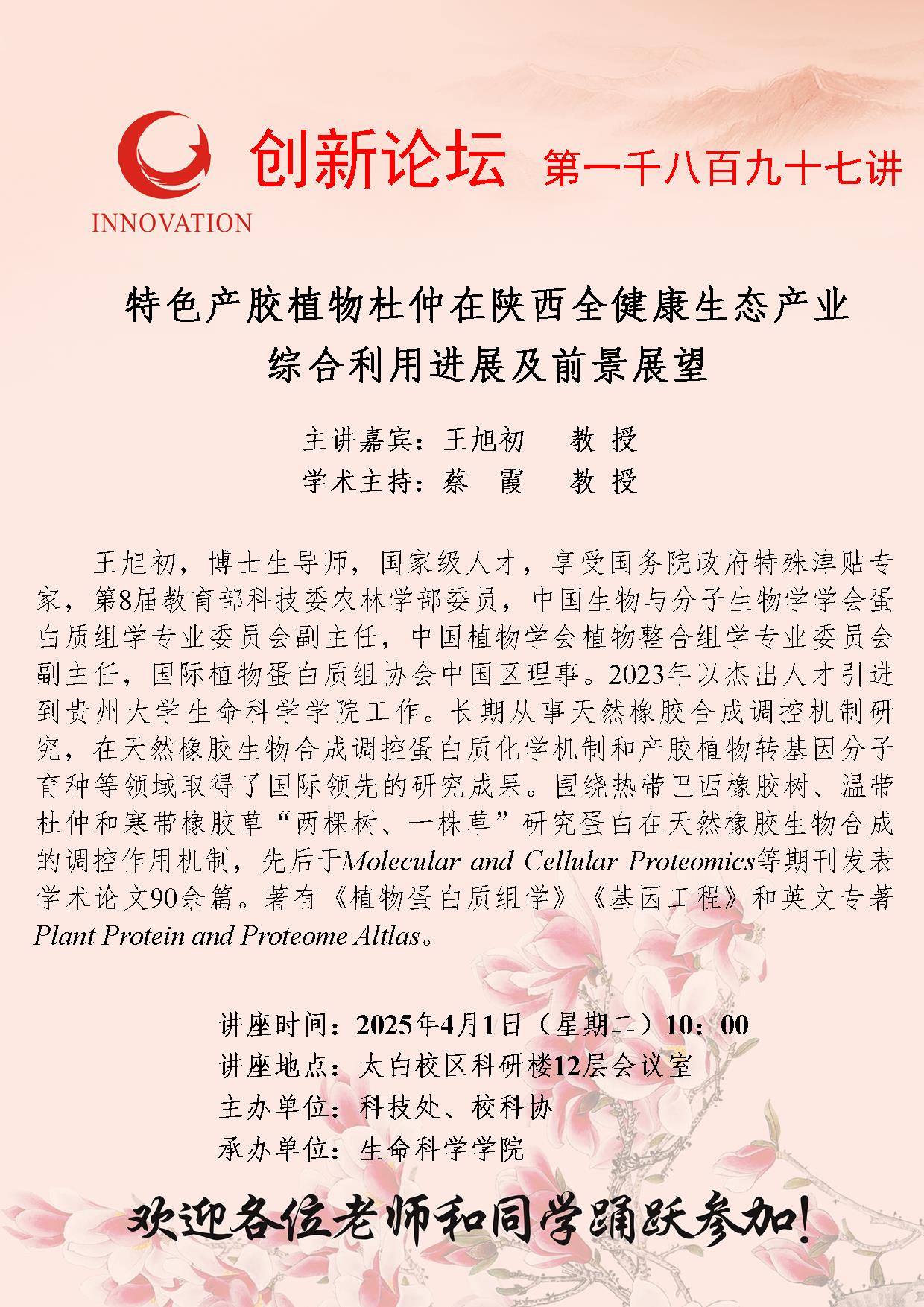 王旭初 教授 欧冠官方网站创新论坛第一千八百九十七讲:特色产胶植物杜仲在陕西全健康生态产业综合利用进展及前景展望 讲座时间 2025年4月1日(星期二)10:00 讲座地点 太白校区科研楼12层会议室 讲座人介绍 王旭初 教授 讲座内容