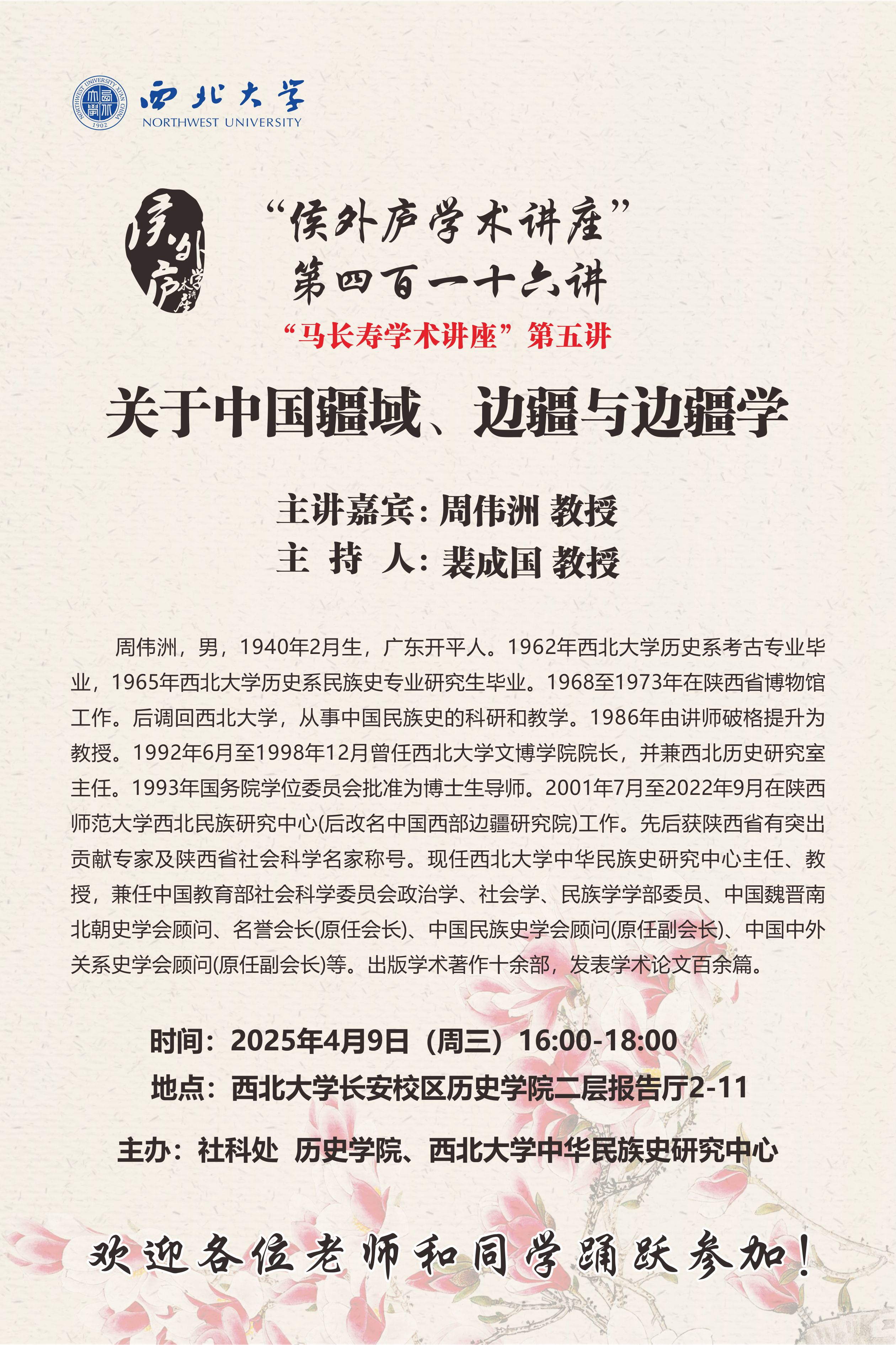 周伟洲 教授 “侯外庐学术讲座”第四百一十六讲:关于中国疆域、边疆与边疆学 讲座时间 2025年4月9日(周三)16:00-18:00 讲座地点 欧冠官方网站长安校区历史学院二层报告厅2-11 讲座人介绍 周伟洲 教授 讲座内容