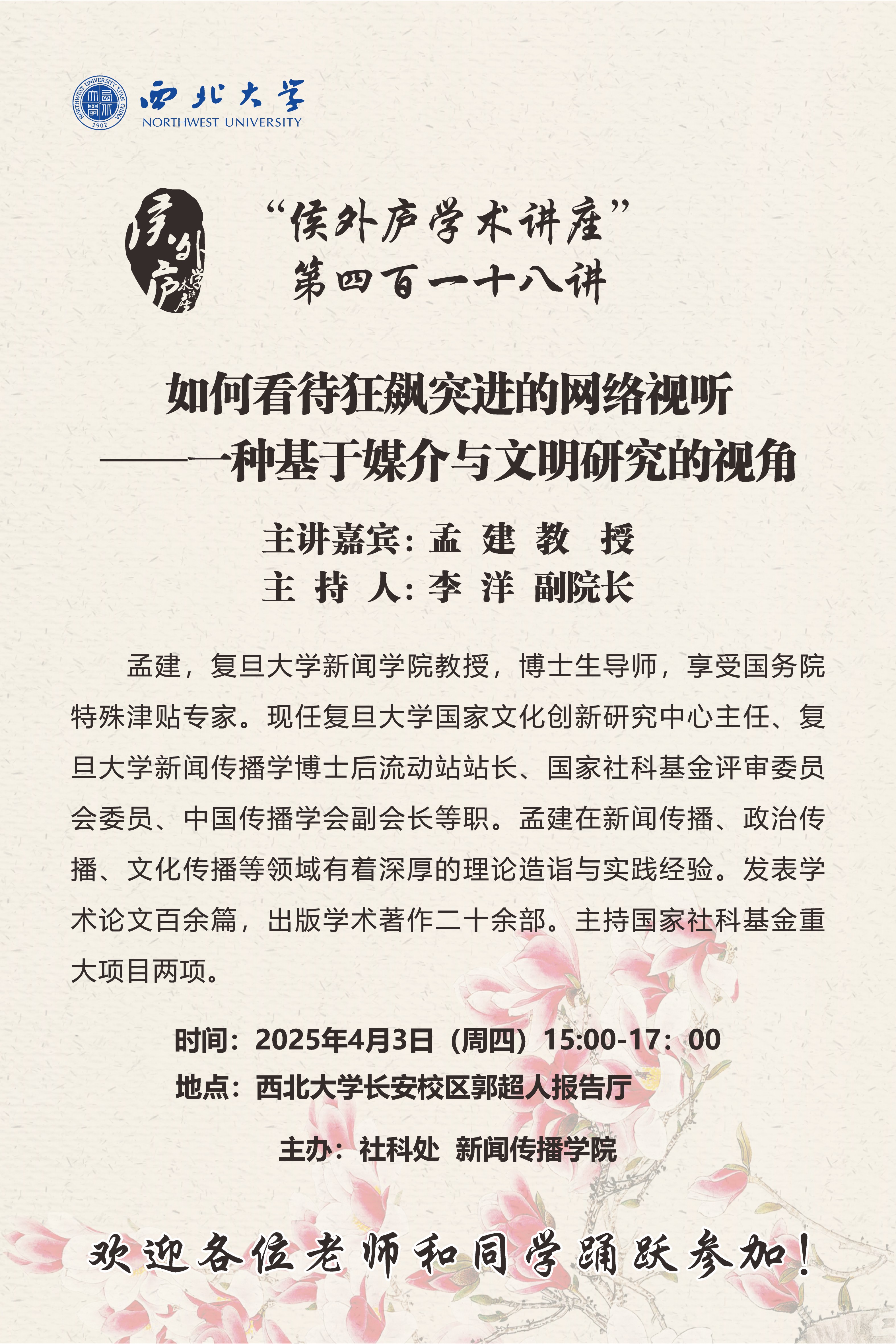 孟建 教授 “侯外庐学术讲座”第四百一十八讲:如何看待狂飙突进的网络视听——一种基于媒介与文明研究的视角 讲座时间 2025年4月3日(周四)15:00-17:00 讲座地点 欧冠官方网站长安校区郭超人报告厅 讲座人介绍 孟建 教授 讲座内容