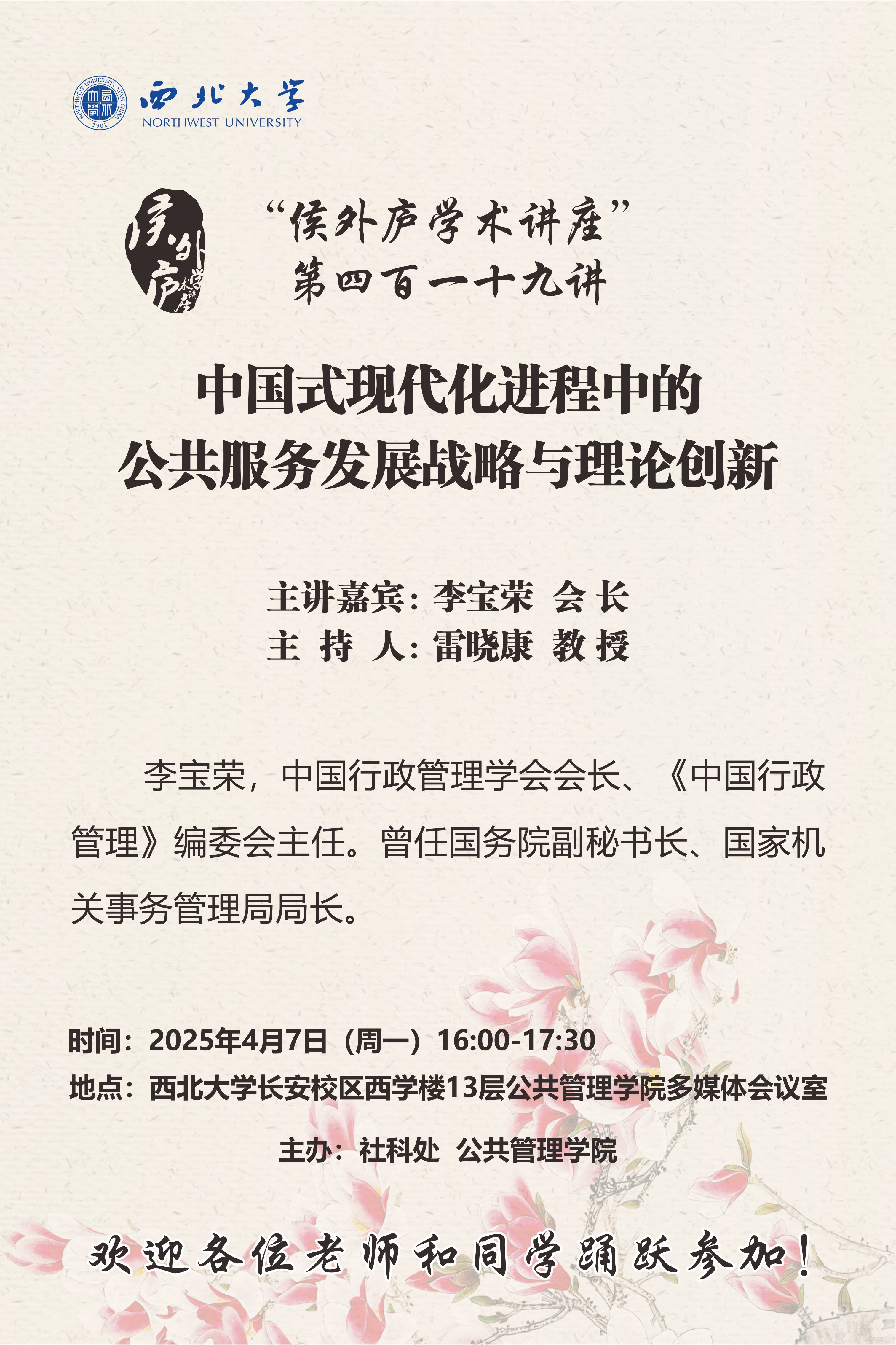 李宝荣 会长 “侯外庐学术讲座”第四百一十九讲:中国式现代化进程中的公共服务发展战略与理论创新 讲座时间 2025年4月7日(周一)16:00-17:30 讲座地点 长安校区西学楼公共管理学院多媒体会议室 讲座人介绍 李宝荣 会长 讲座内容