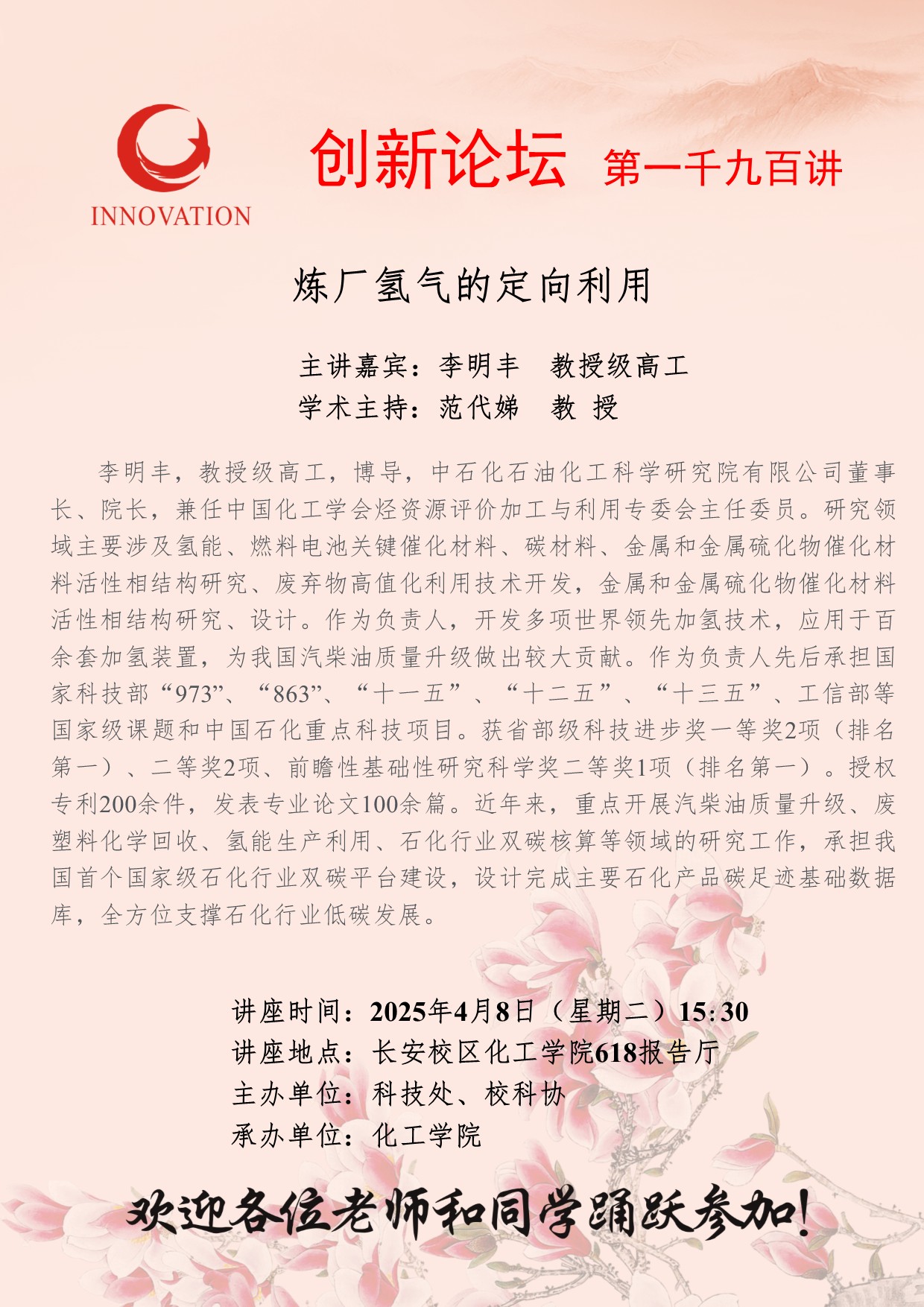 李明丰 教授级高工 欧冠官方网站创新论坛第一千九百讲:炼厂氢气的定向利用 讲座时间 2025年4月8日(星期二)15:30 讲座地点 长安校区化工学院618报告厅 讲座人介绍 李明丰 教授级高工 讲座内容