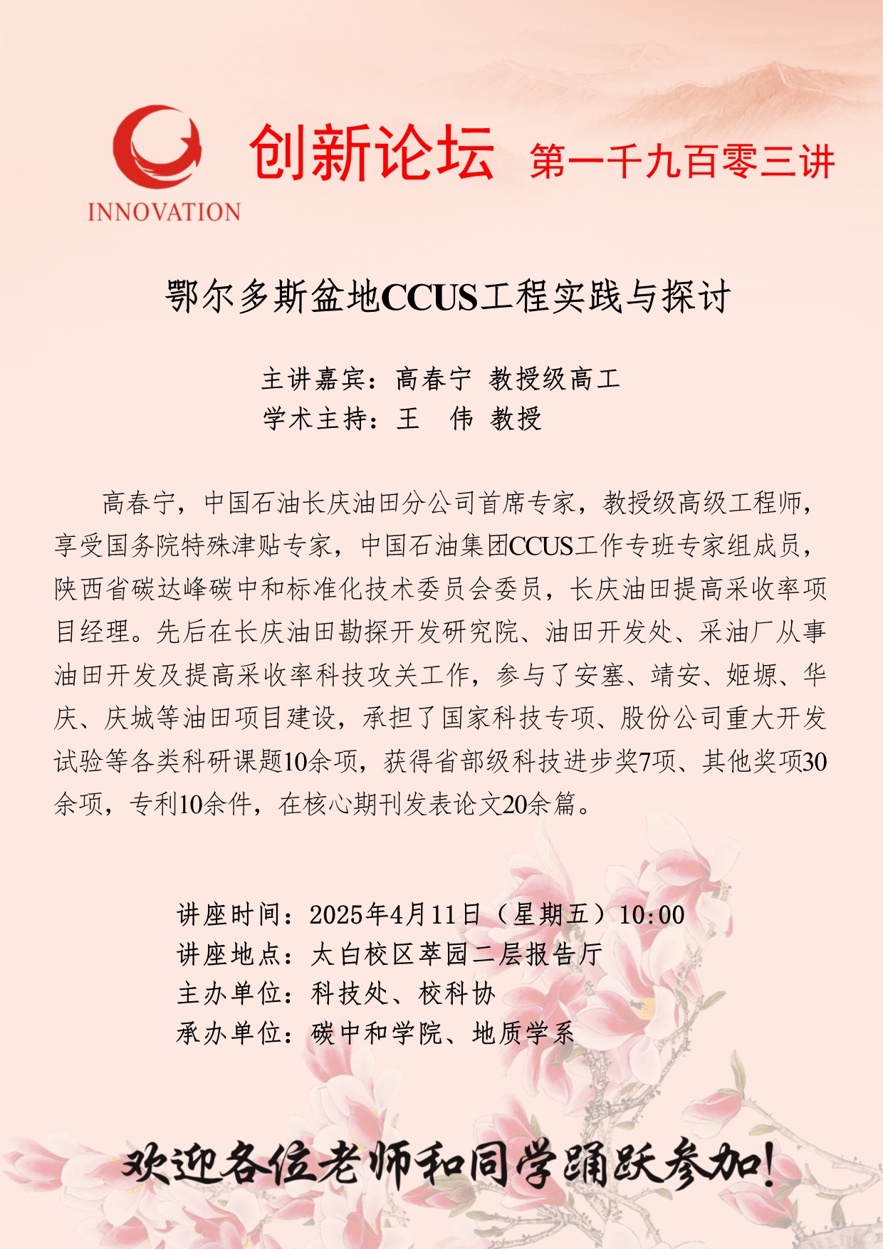 高春宁 教授级高工 欧冠官方网站创新论坛第一千九百零三讲:鄂尔多斯盆地CCUS工程实践与探讨 讲座时间 2025年4月11日(星期五)10:00 讲座地点 太白校区萃园二层报告厅 讲座人介绍 高春宁 教授级高工 讲座内容