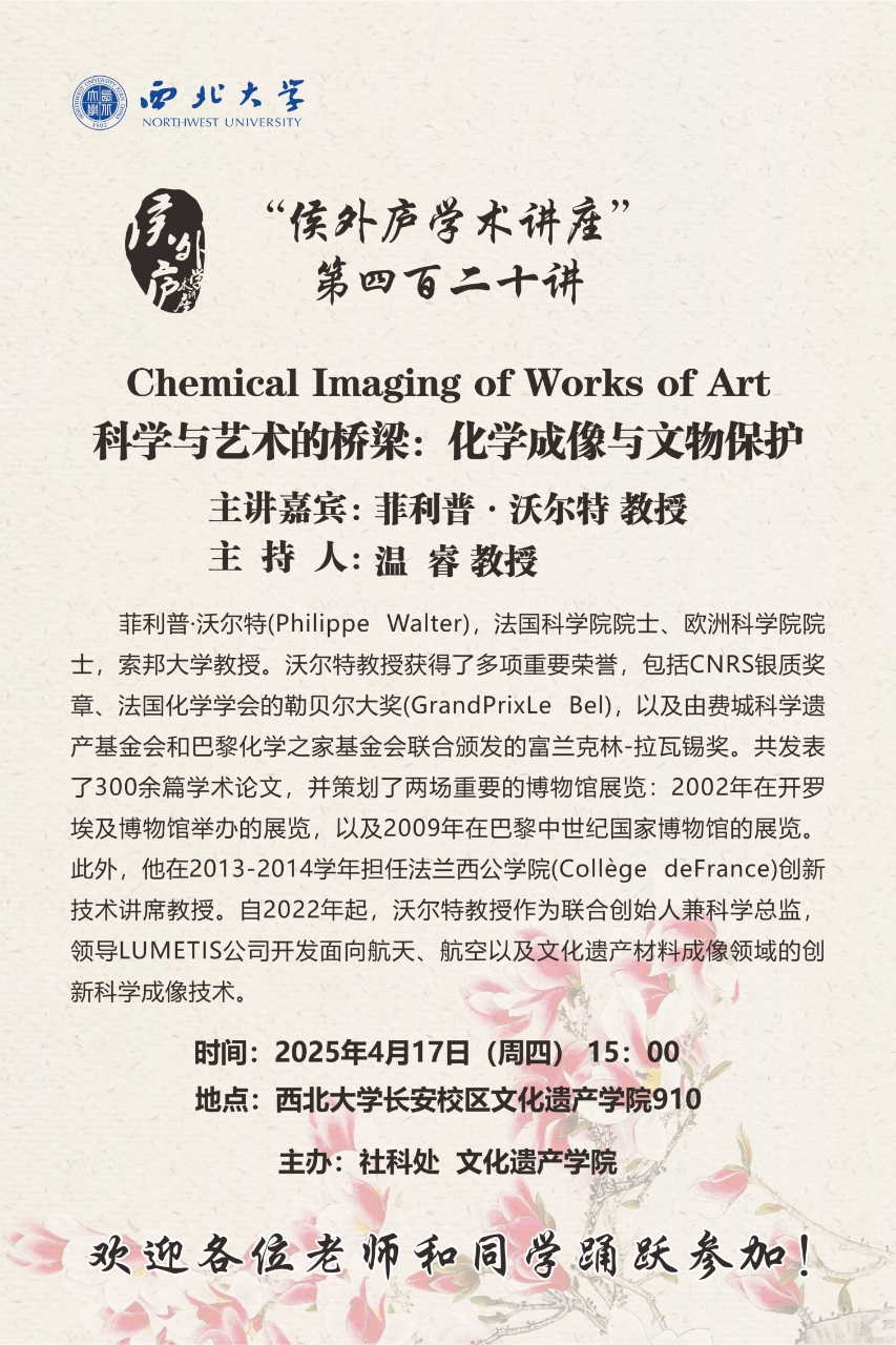 菲利普·沃尔特 教授 “侯外庐学术讲座”第四百二十讲:Chemical Imaging of Works of Art科学与艺术的桥梁:化学成像与文物保护 讲座时间 2025年4月17日(周四)15:00 讲座地点 欧冠官方网站长安校区文化遗产学院910 讲座人介绍 菲利普·沃尔特 教授 讲座内容
