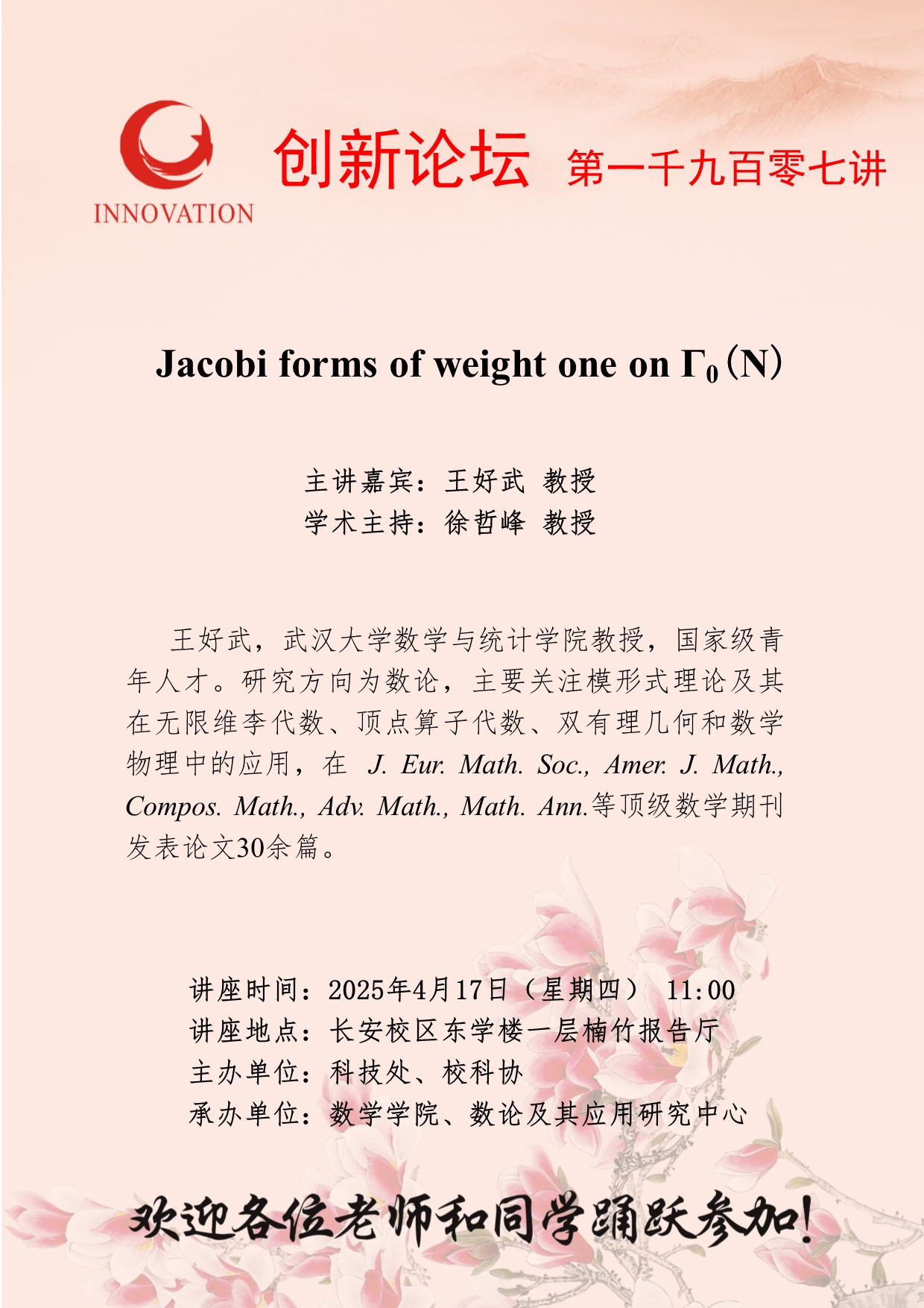 王好武 教授 欧冠官方网站创新论坛第一千九百零七讲:Jacobi forms of weight one on Γ0(N) 讲座时间 2025年4月17日(星期四) 11:00 讲座地点 长安校区东学楼一层楠竹报告厅 讲座人介绍 王好武 教授 讲座内容