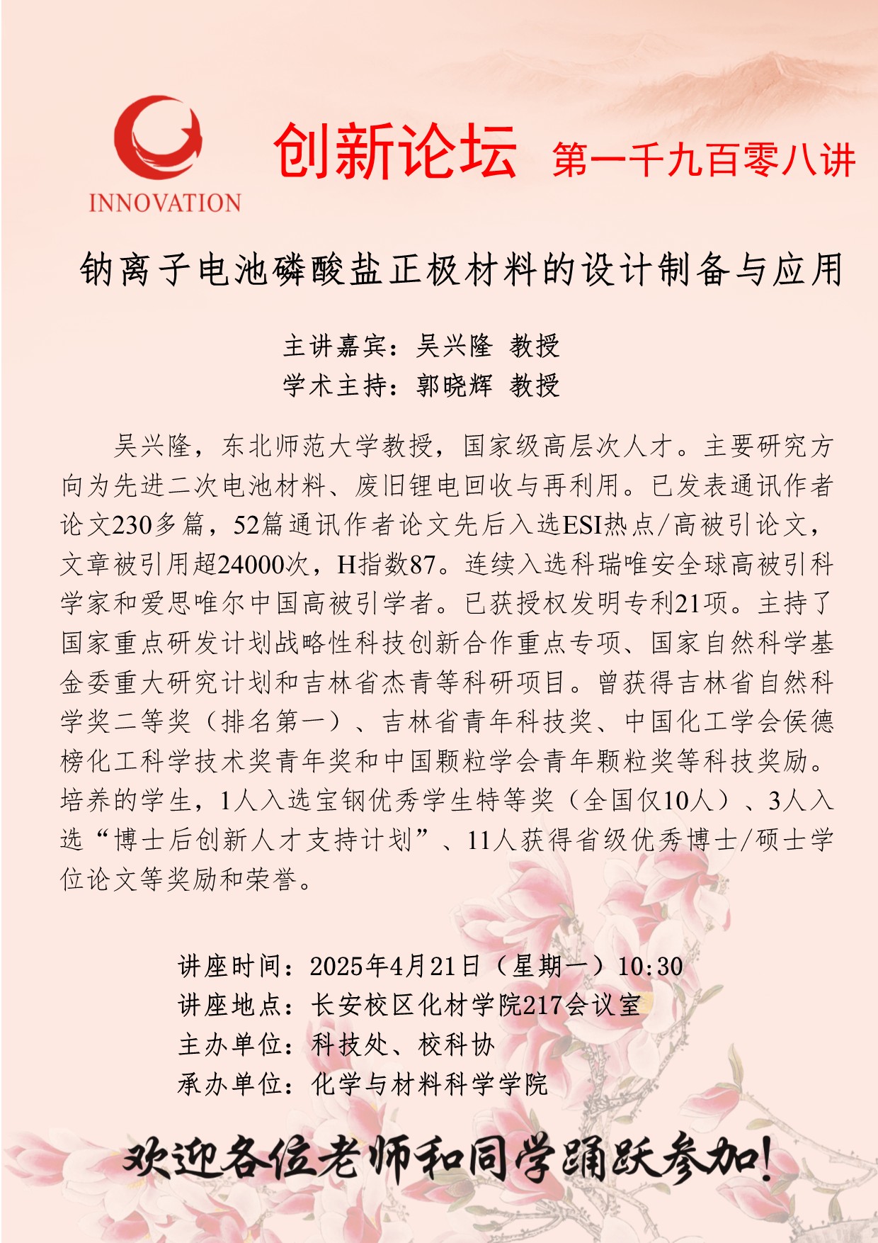 吴兴隆 教授 欧冠官方网站创新论坛第一千九百零八讲:钠离子电池磷酸盐正极材料的设计制备与应用 讲座时间 2025年4月21日(星期一)10:30 讲座地点 长安校区化材学院217会议室 讲座人介绍 吴兴隆 教授 讲座内容