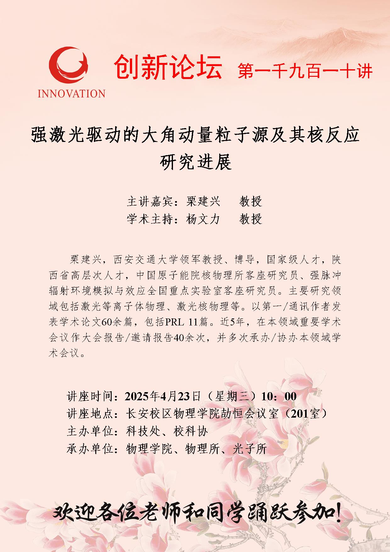 栗建兴 教授 欧冠官方网站创新论坛第一千九百一十讲:强激光驱动的大角动量粒子源及其核反应研究进展 讲座时间 2025年4月23日(星期三)10:00 讲座地点 长安校区物理学院劼恒会议室(201室) 讲座人介绍 栗建兴 教授 讲座内容