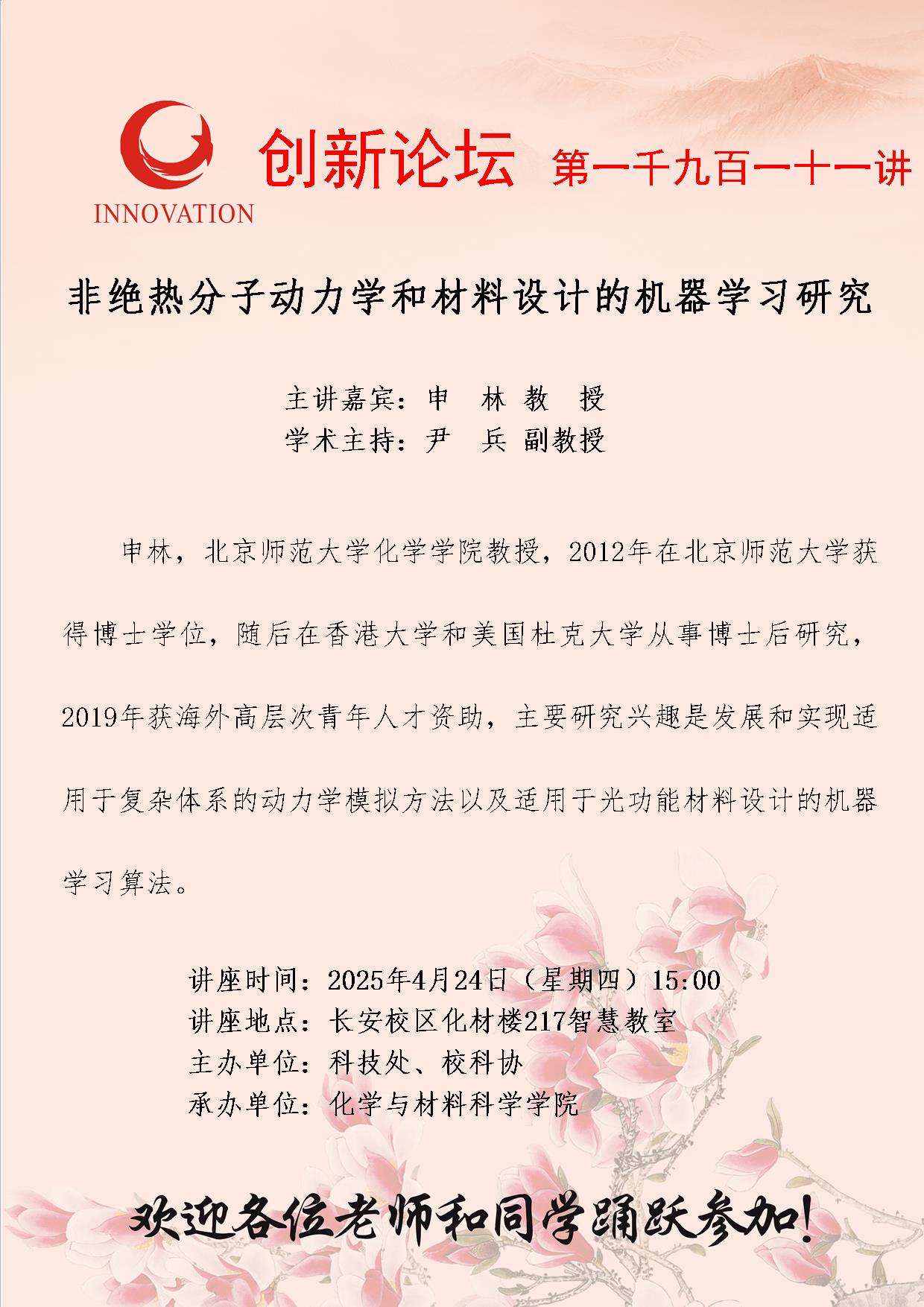 申林 教授 欧冠官方网站创新论坛第一千九百一十一讲:非绝热分子动力学和材料设计的机器学习研究 讲座时间 2025年4月24日(星期四)15:00 讲座地点 长安校区化材楼217智慧教室 讲座人介绍 申林 教授 讲座内容