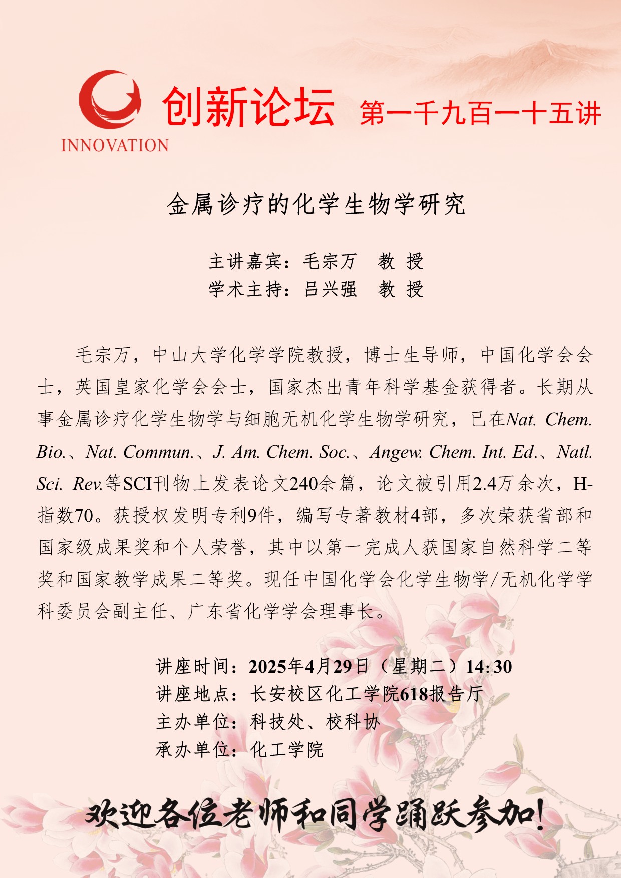 毛宗万 教授 欧冠官方网站创新论坛第一千九百一十五讲:金属诊疗的化学生物学研究 讲座时间 2025年4月29日(星期二)14:30 讲座地点 长安校区化工学院618报告厅 讲座人介绍 毛宗万 教授 讲座内容