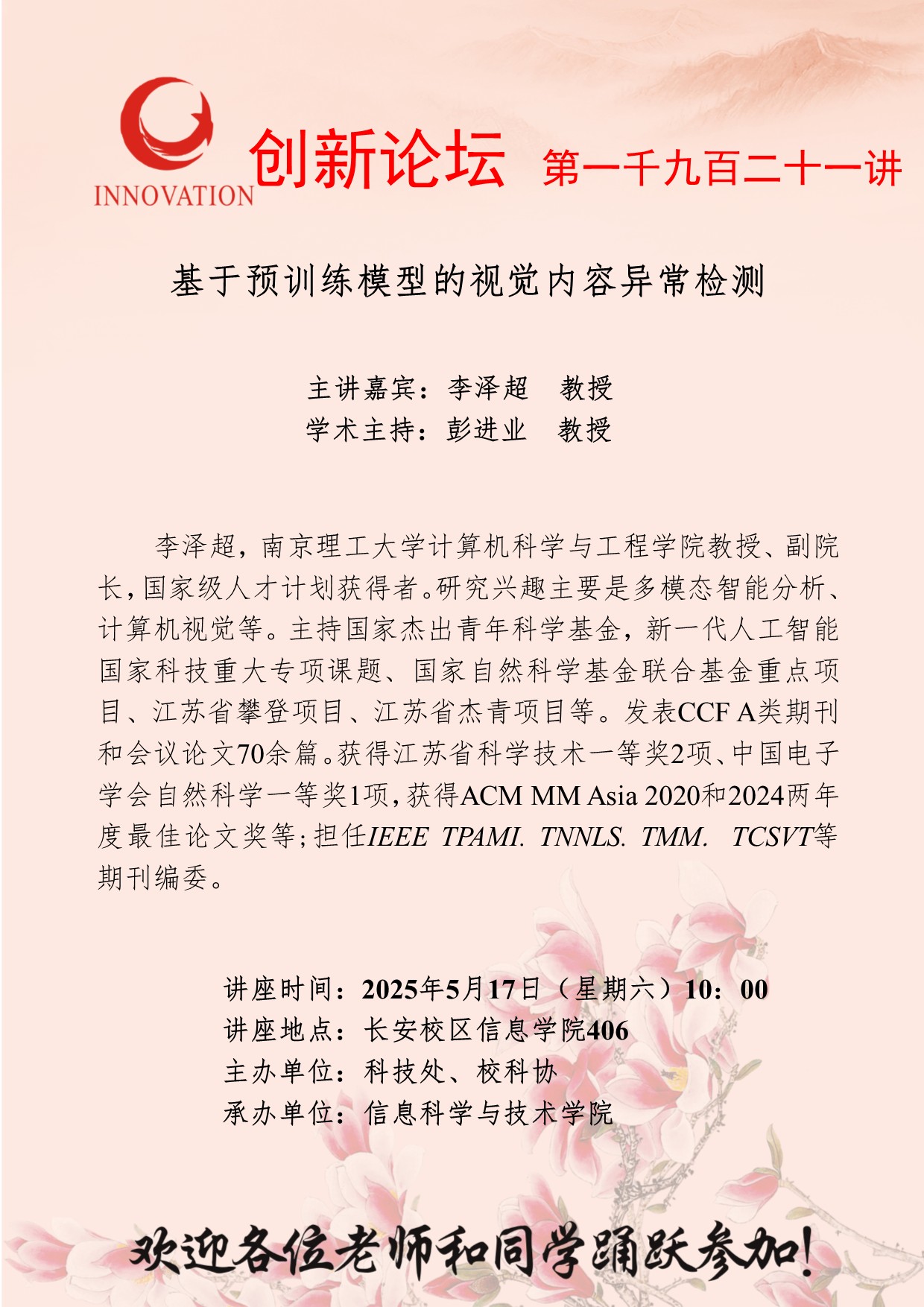 李泽超 教授 欧冠官方网站创新论坛第一千九百二十一讲:基于预训练模型的视觉内容异常检测 讲座时间 2025年5月17日(星期六)10:00 讲座地点 长安校区信息学院406 讲座人介绍 李泽超 教授 讲座内容