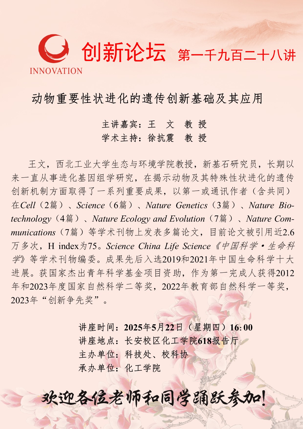王文 教授 欧冠官方网站创新论坛第一千九百二十八讲:动物重要性状进化的遗传创新基础及其应用 讲座时间 2025年5月22日(星期四)16:00 讲座地点 长安校区化工学院618报告厅 讲座人介绍 王文 教授 讲座内容